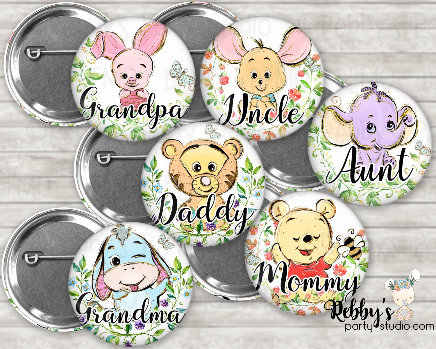 Custom personalized button pins, custom printed with any name, title or phrase. (Ex. Mommy to be, Mommy, Dad to be, or Daddy, Sister to be, etc.) These are a grate addition to any party.