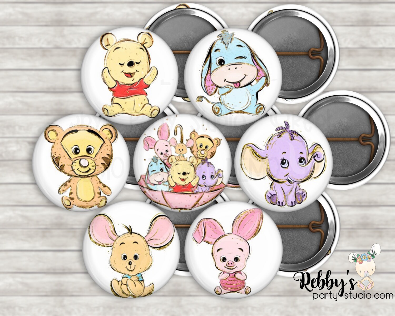 This listing is for Bear & Friends assorted mini buttons, perfect for parties, baby showers, crafts, and small gifts. Designs are assorted and selected from the Bear & Friends theme.