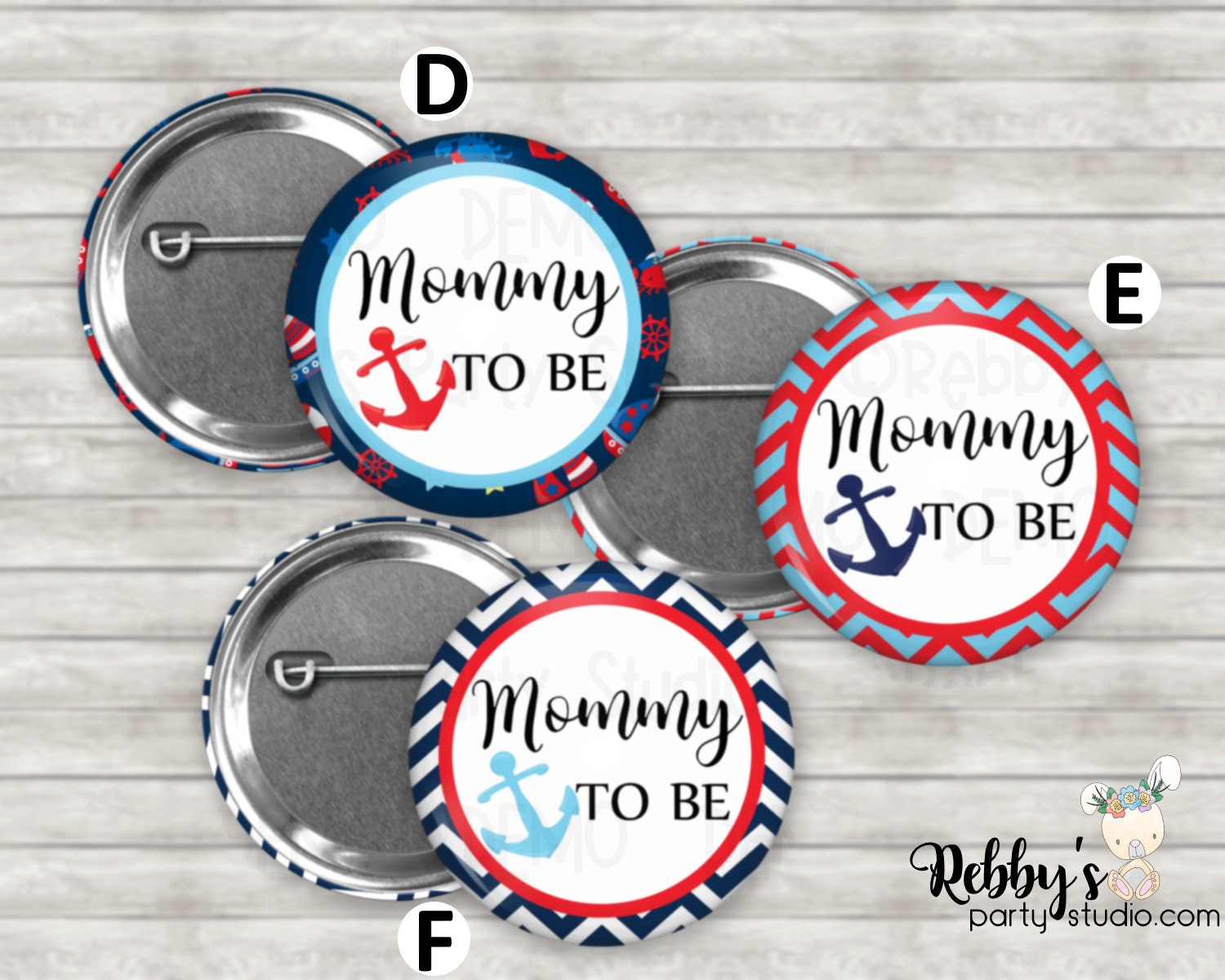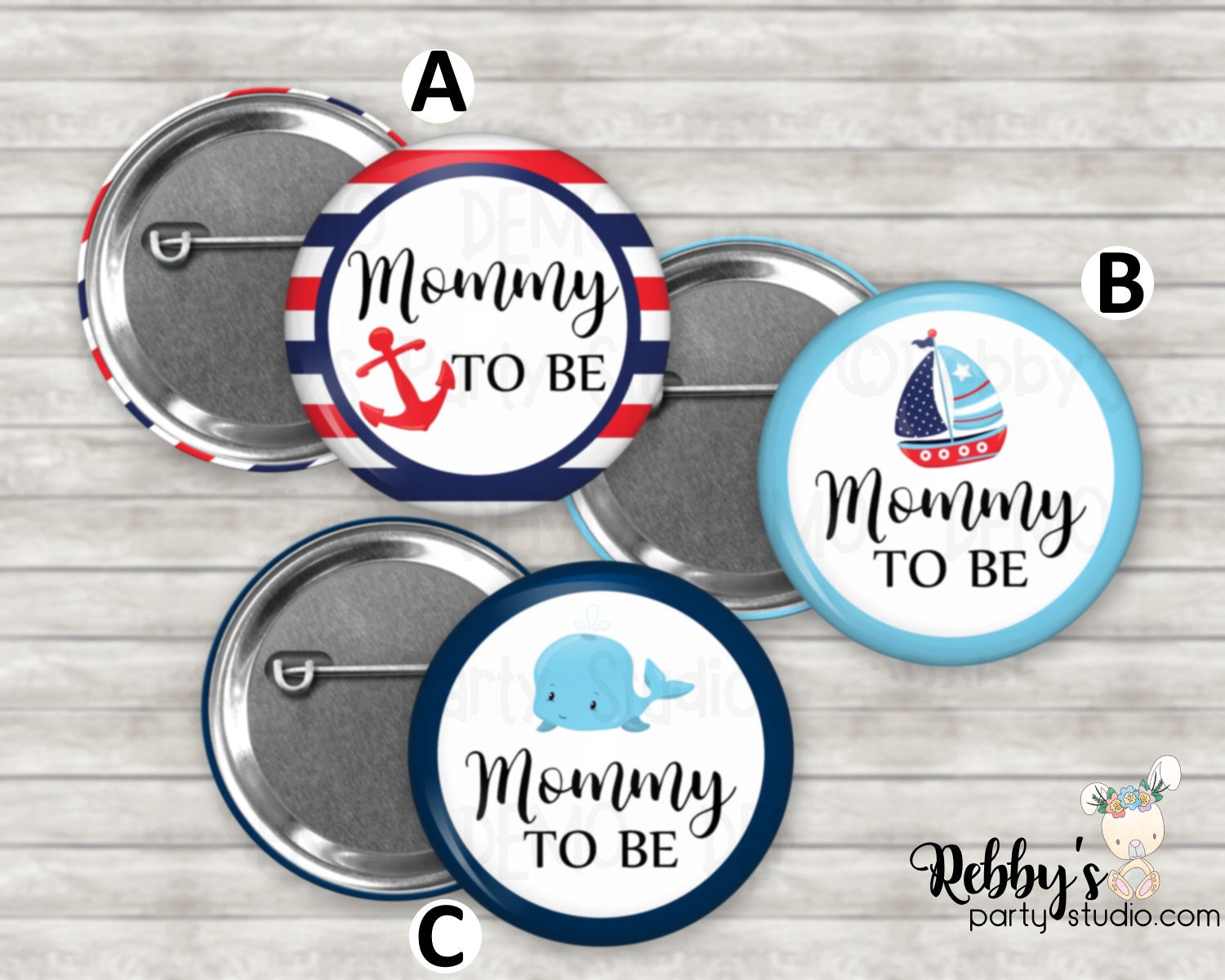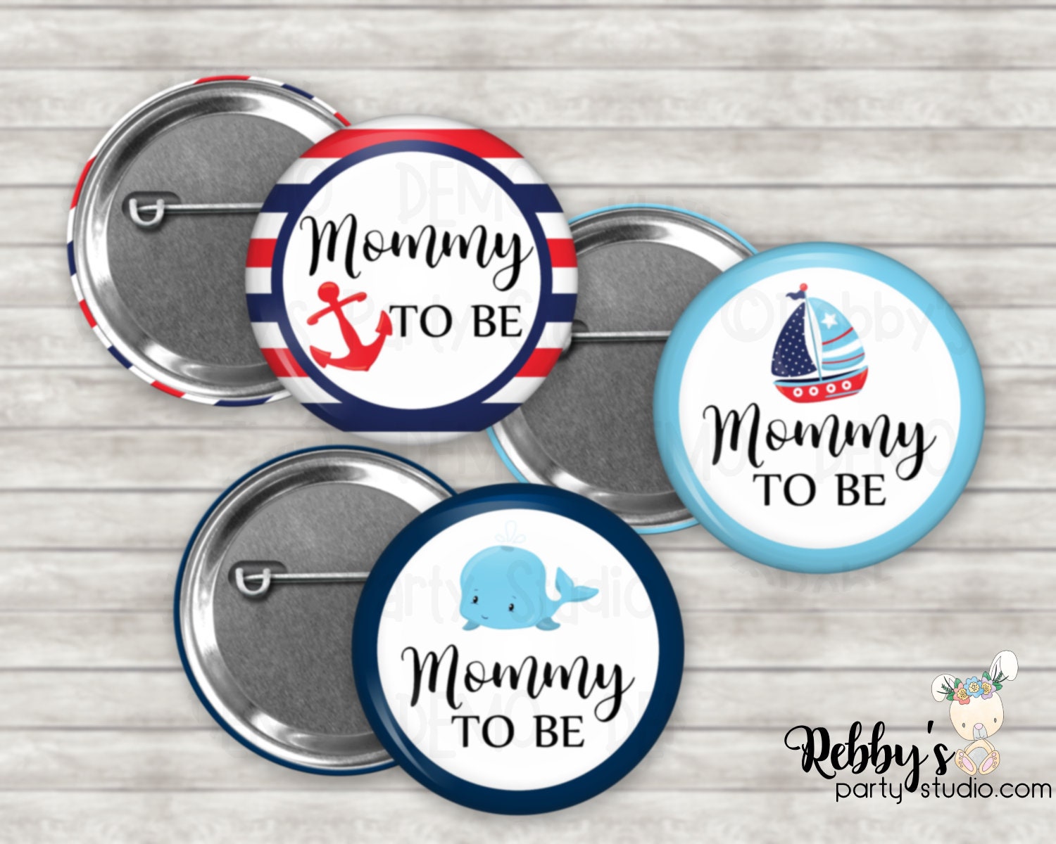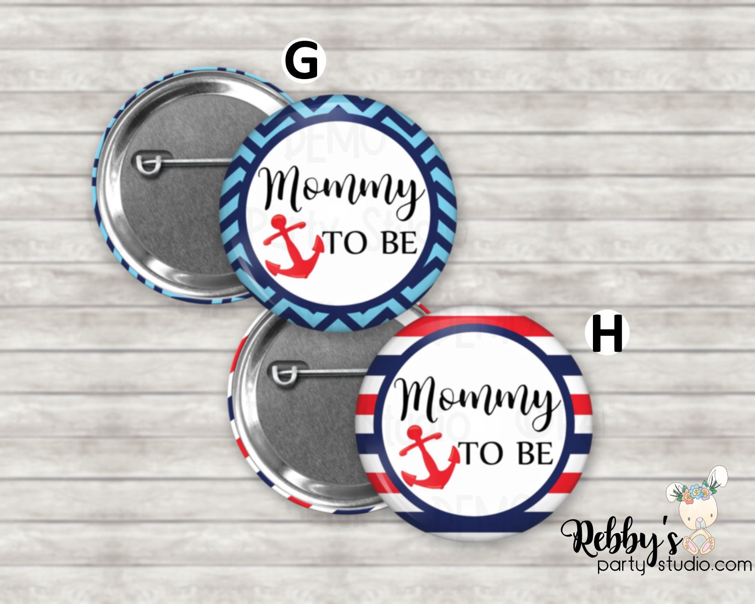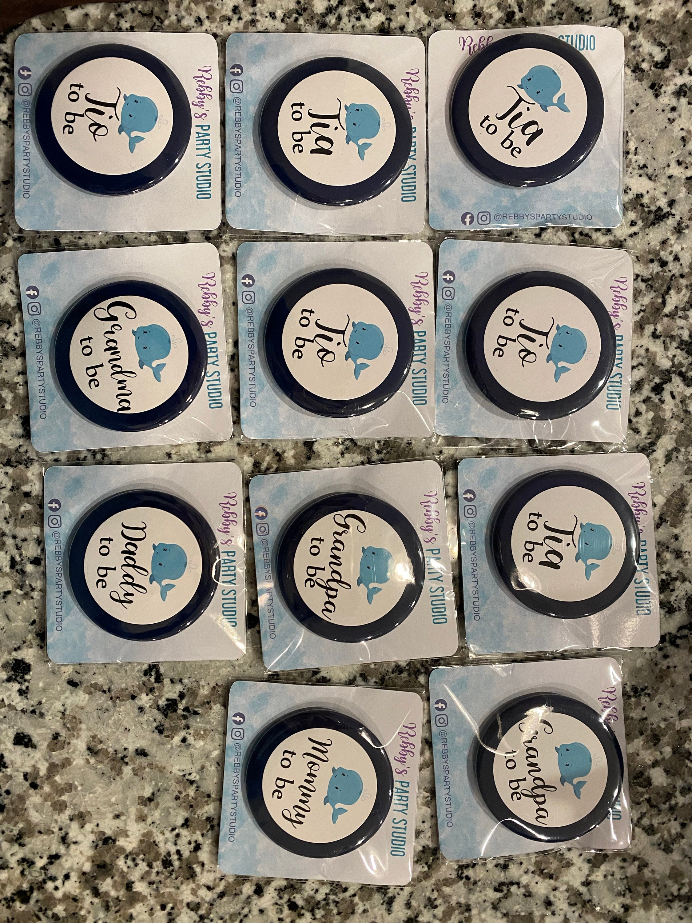 Custom personalized button pins, custom printed with any name, title or phrase. (Ex. Mommy to be, Mommy, Dad to be, or Daddy, Sister to be, etc.) These are a grate addition to any party.