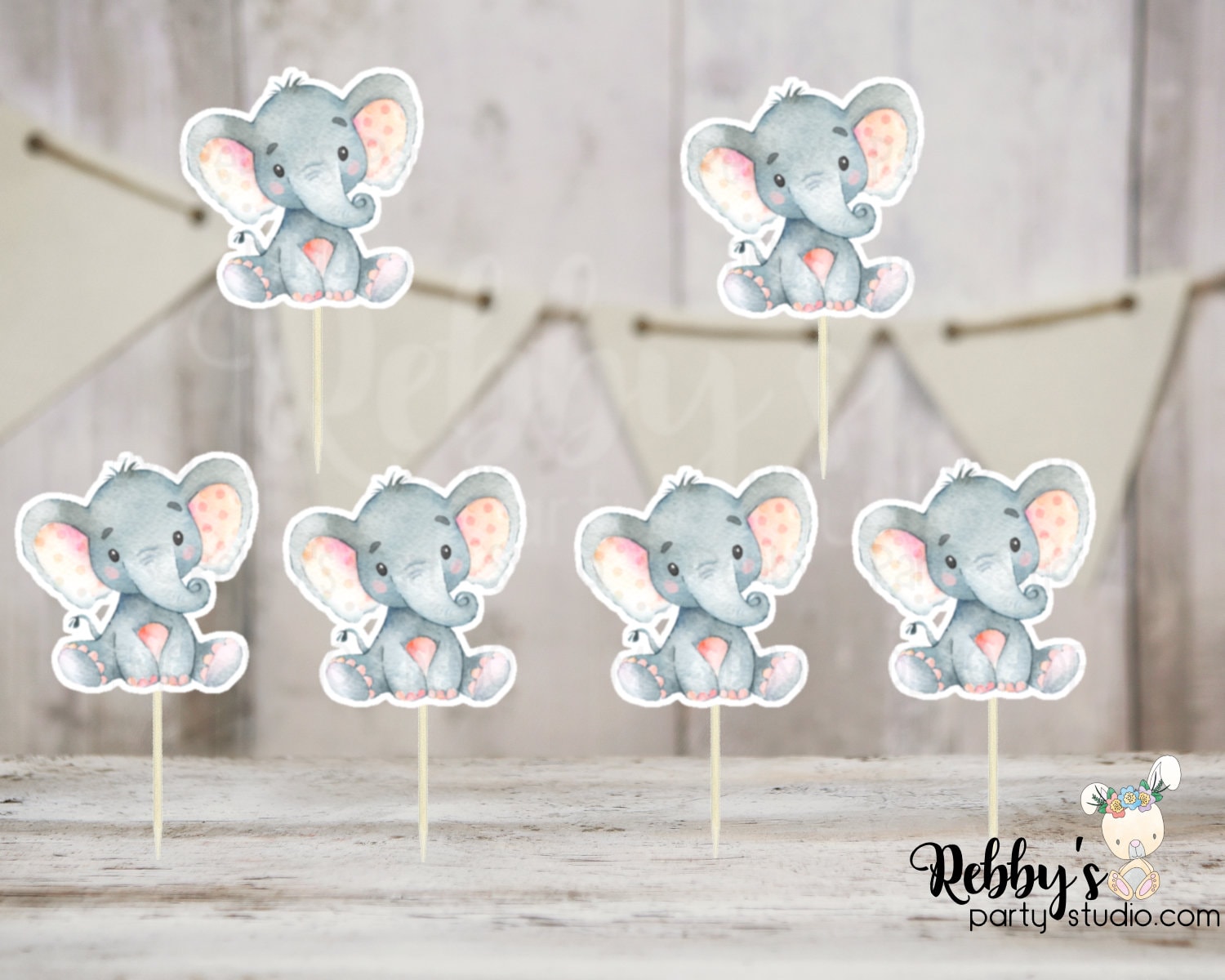Set of 12 Pink Peach Elephant cupcake toppers printed on high quality cardstock glued to a round sturdy toothpick, you will receive 12 picks shown in the sample picture. Toppers are handcrafted and handmade by me for a unique look that can't be found in a regular party supply store. They have many uses you can place them on cupcakes, cookies, sandwiches, brownies, fruits, cheese and more!