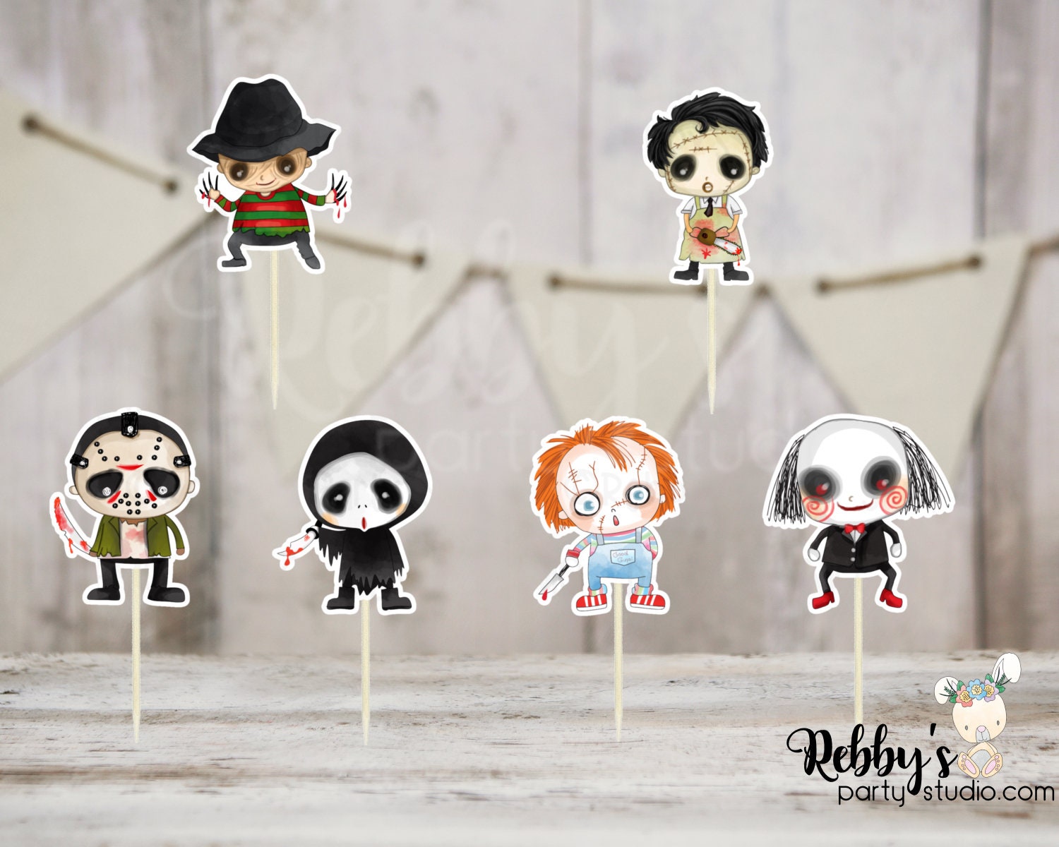 Set of 12 Cute Horror Movie Characters cupcake toppers printed on high quality cardstock glued to a round sturdy toothpick, you will receive 12 picks two of each shown in the sample picture. Toppers are handcrafted and handmade by me for a unique look that can't be found in a regular party supply store. They have many uses you can place them on cupcakes, cookies, sandwiches, brownies, fruits, cheese and more!