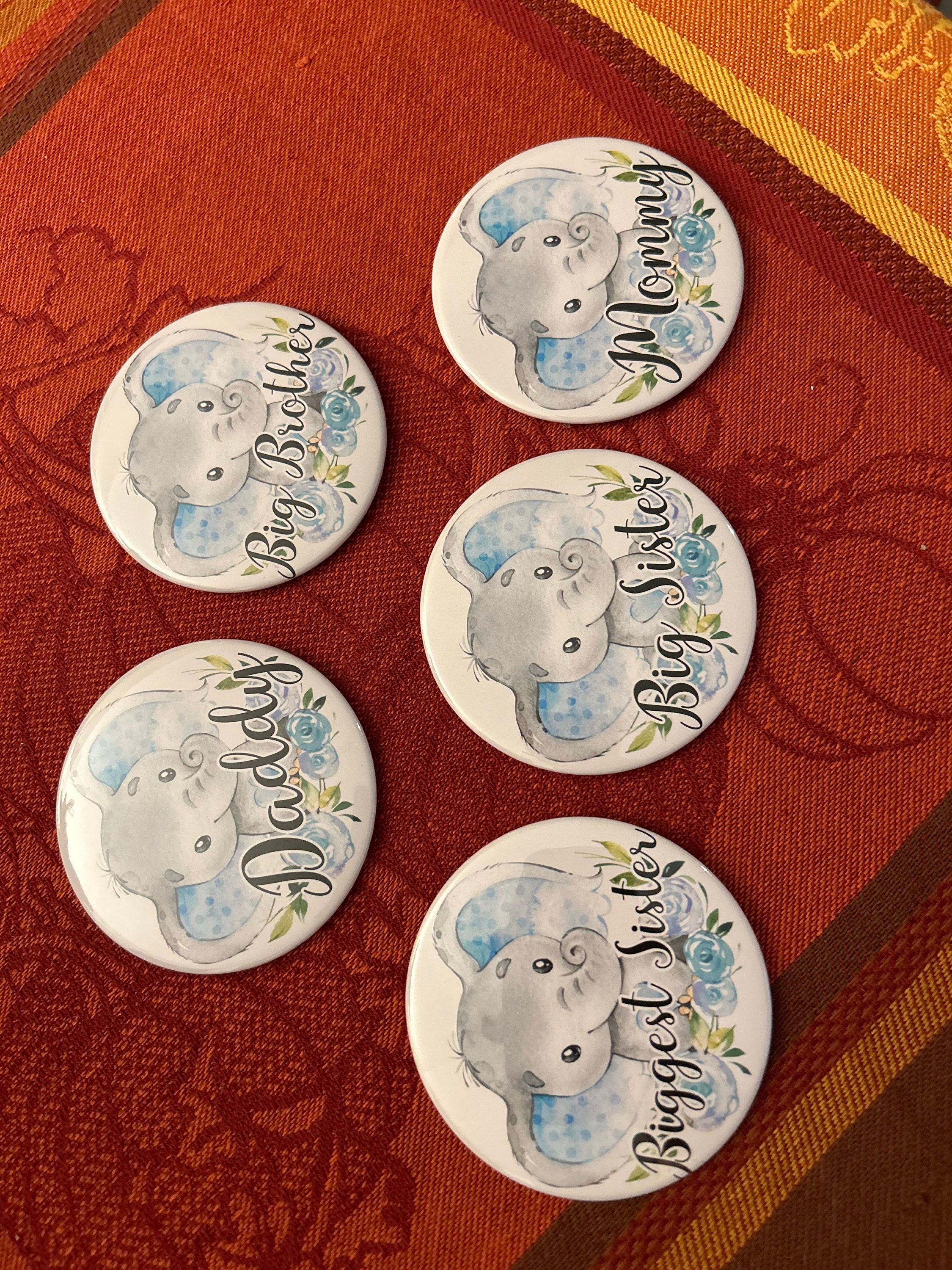 Custom personalized button pins, custom printed with any name, title or phrase. (Ex. Mommy to be, Mommy, Dad to be, or Daddy, Sister to be, etc.) These are a grate addition to any party.