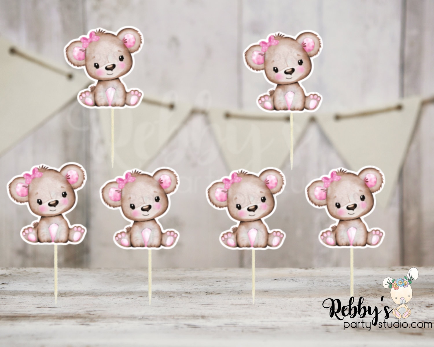 Set of 12 Pink Girl Brown Bear with Bow cupcake toppers printed on high quality cardstock glued to a round sturdy toothpick, you will receive 12 picks shown in the sample picture. Toppers are handcrafted and handmade by me for a unique look that can't be found in a regular party supply store. They have many uses you can place them on cupcakes, cookies, sandwiches, brownies, fruits, cheese and more!