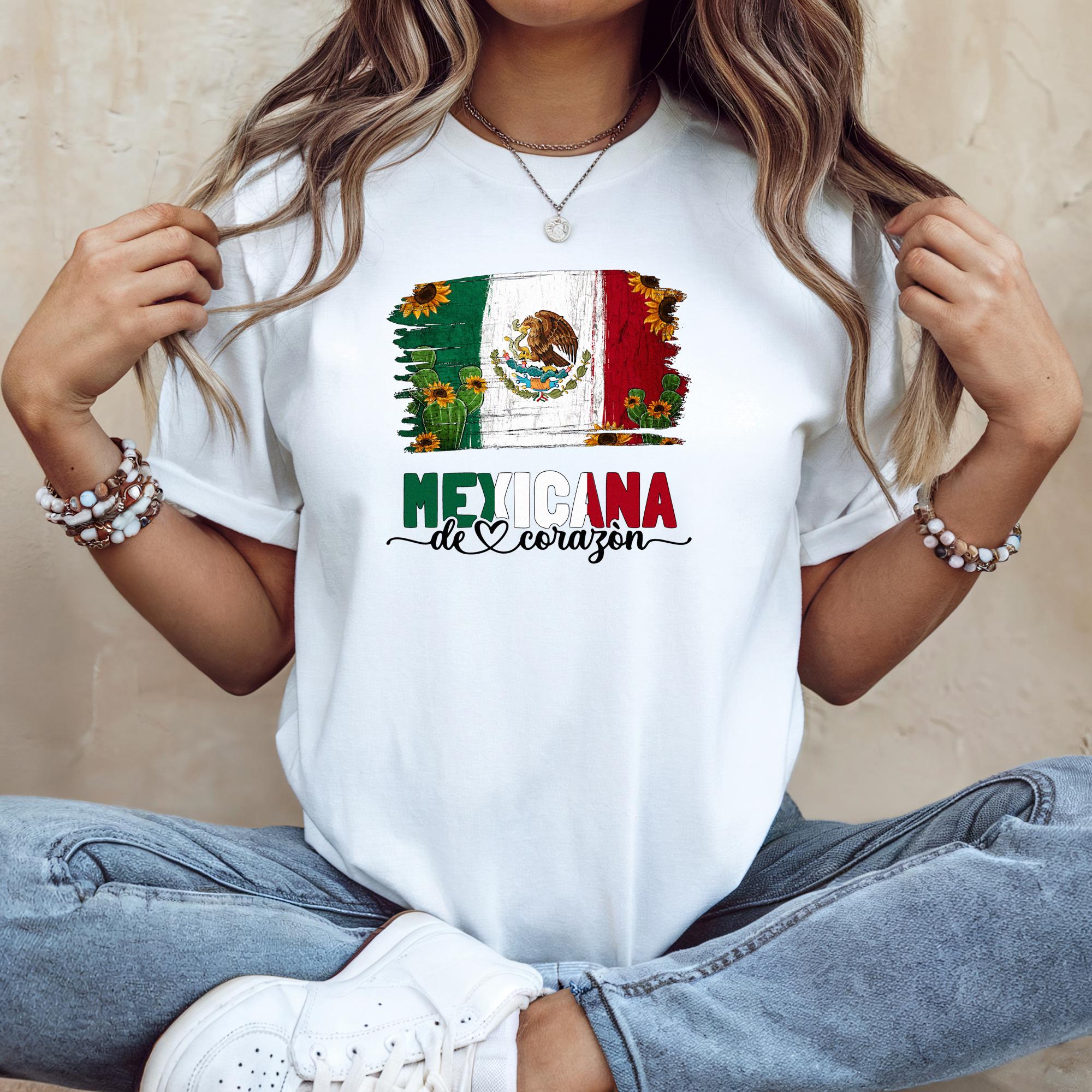 This listing is for a Mexicana de Corazón graphic t-shirt, featuring a Mexico flag design with the phrase “Mexicana de Corazón” styled with a heart motif. This design is printed on white shirts only for a clean, classic look.