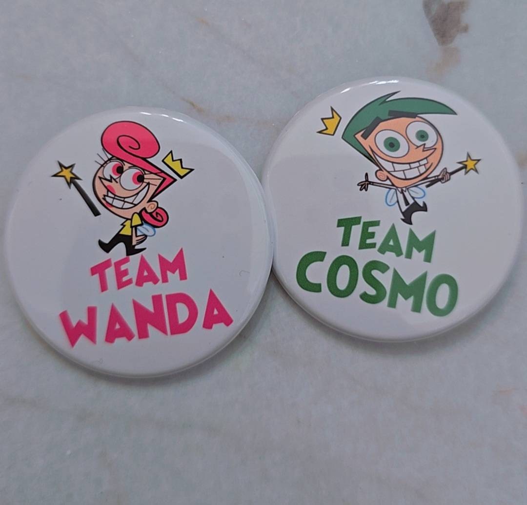 Listing is for Fairly Godparents Gender Reveal Team Cosmo or Team Wanda pin back buttons. Images are printed on high quality white matte paper and covered with mylar. Pin Buttons are hand pressed by me. All buttons are made to order.