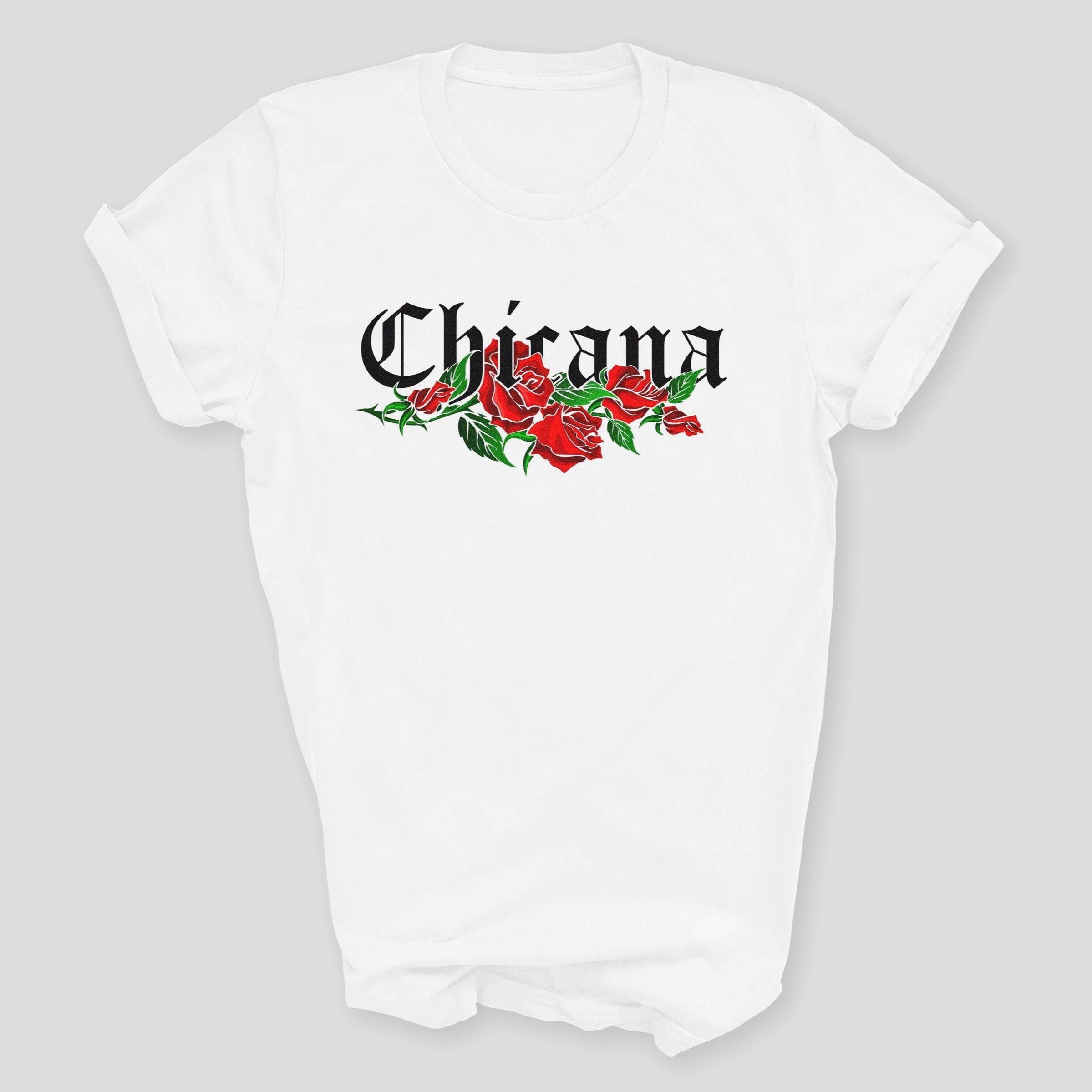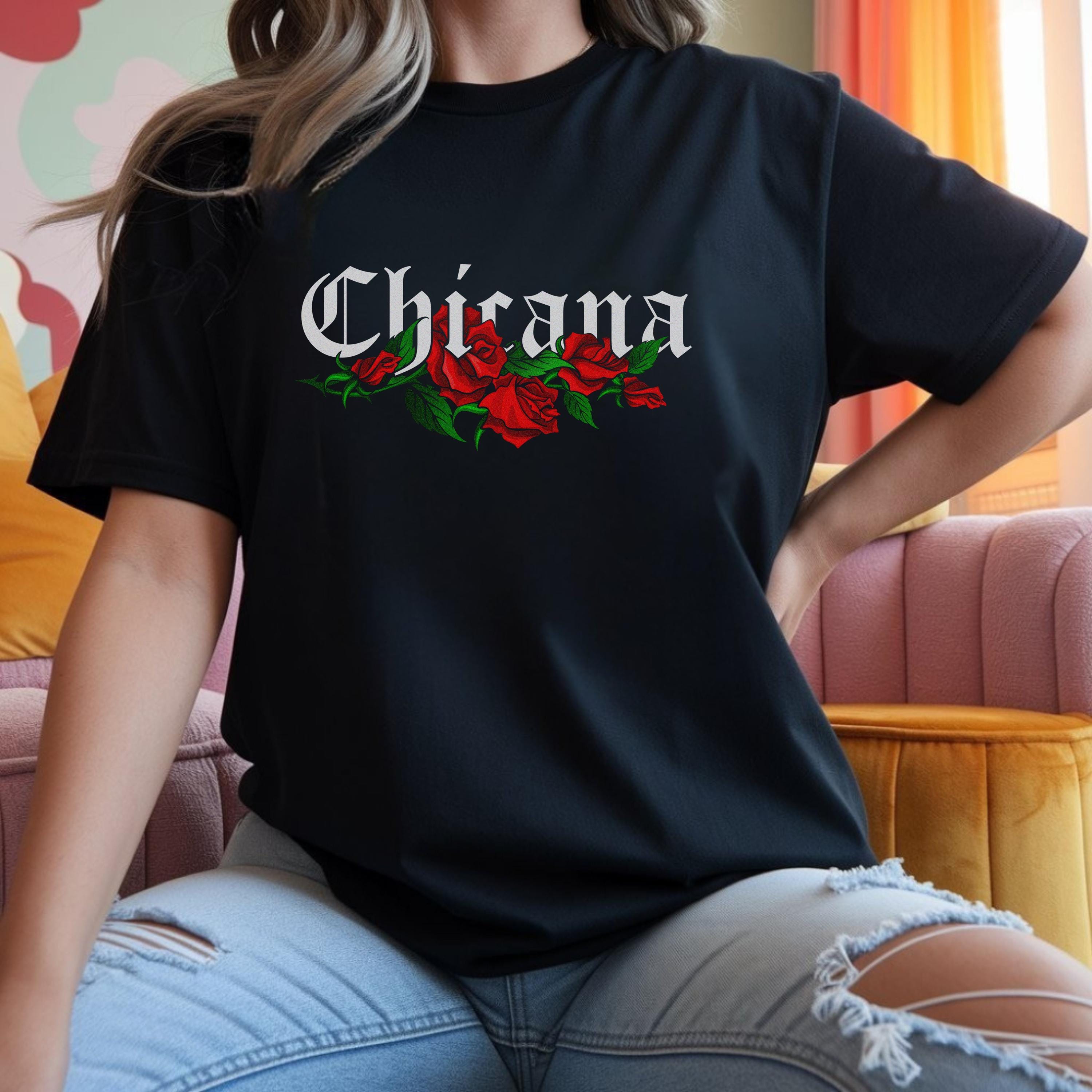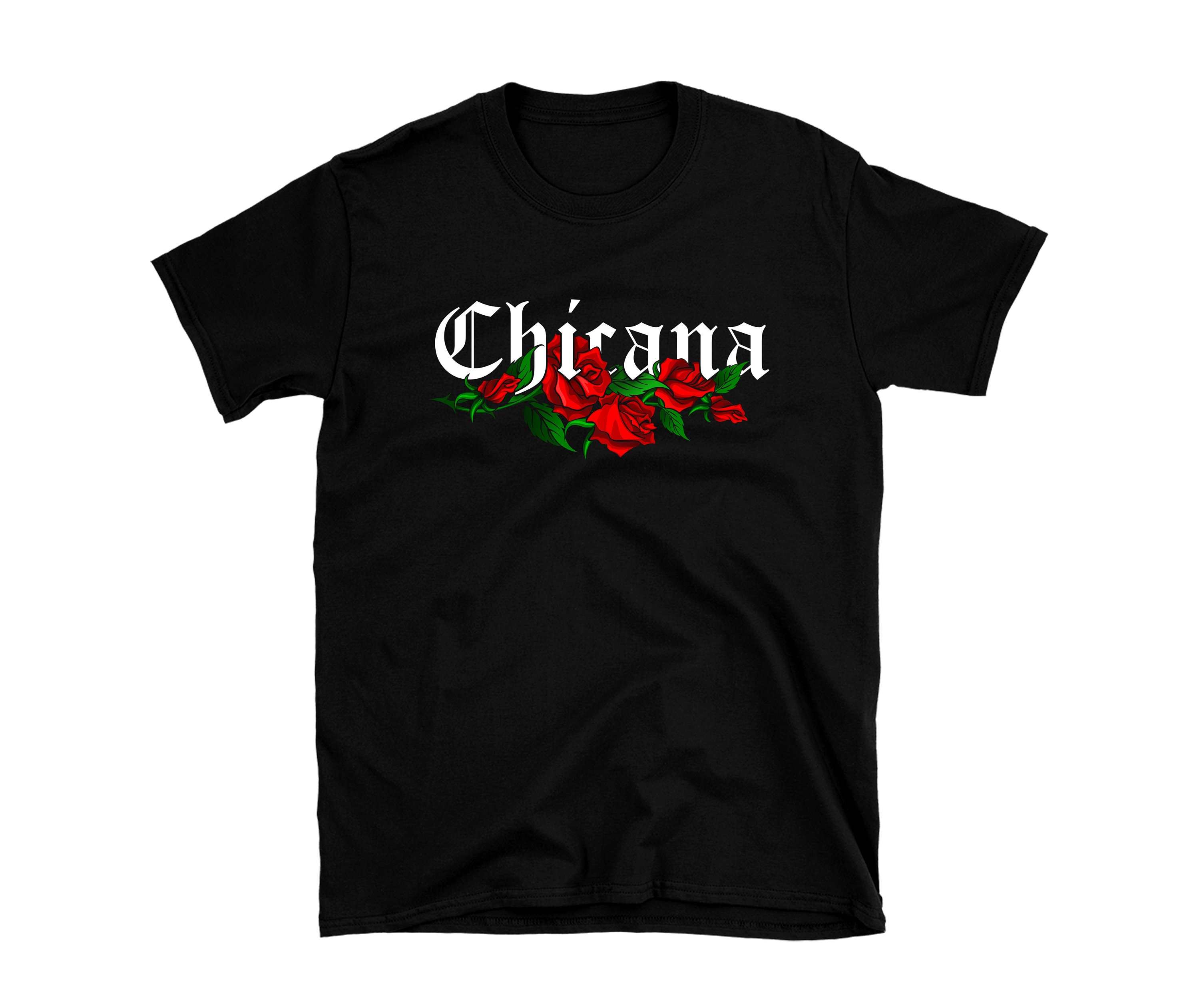 Celebrate culture, pride, and bold style with this Chicana graphic t-shirt, featuring the word Chicana with red roses beneath it. Each shirt is made to order and printed in-house for a high-quality, long-lasting finish.