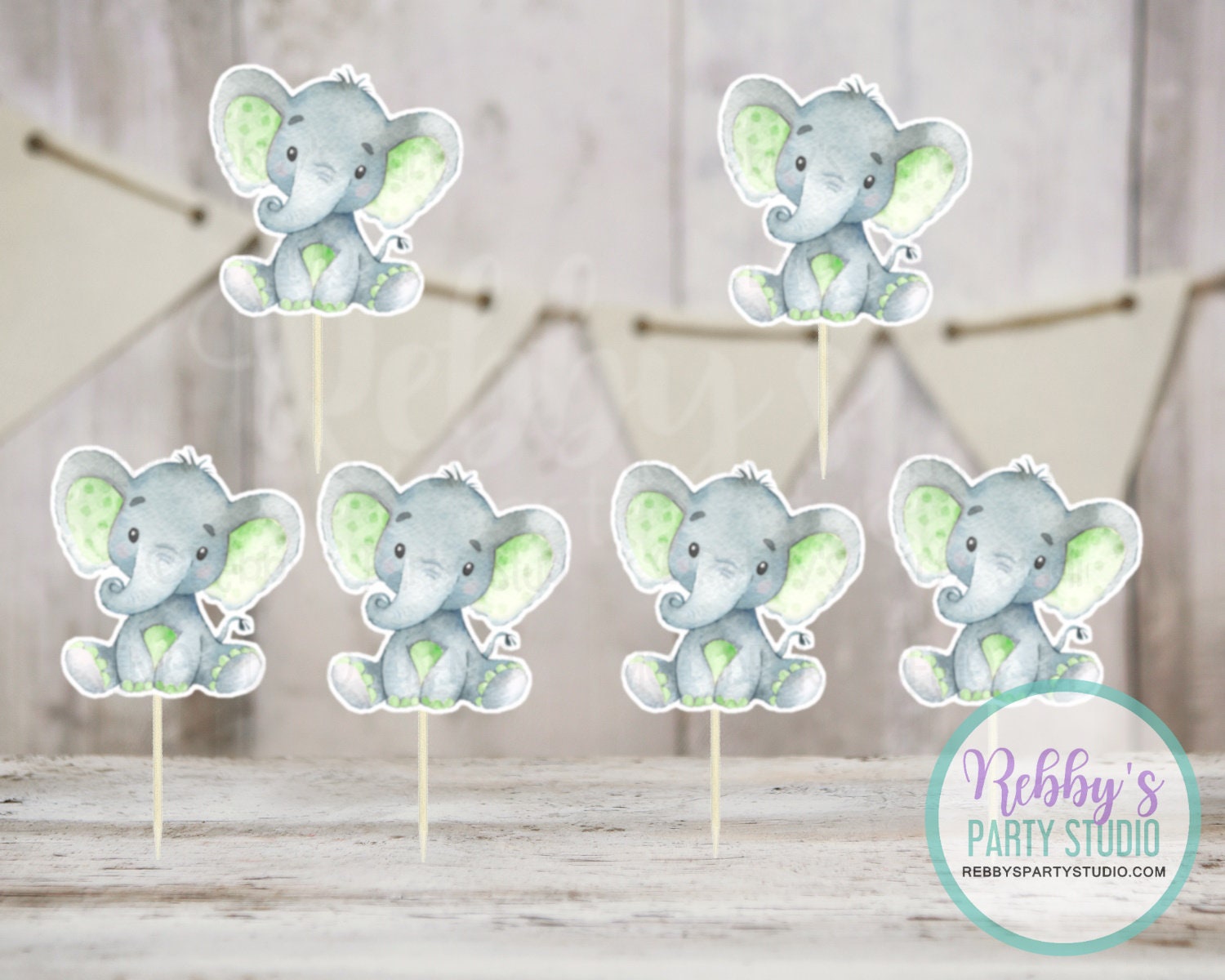 Set of 12 Green Elephant cupcake toppers printed on high quality cardstock glued to a round sturdy toothpick, you will receive 12 picks shown in the sample picture. Toppers are handcrafted and handmade by me for a unique look that can't be found in a regular party supply store. They have many uses you can place them on cupcakes, cookies, sandwiches, brownies, fruits, cheese and more!