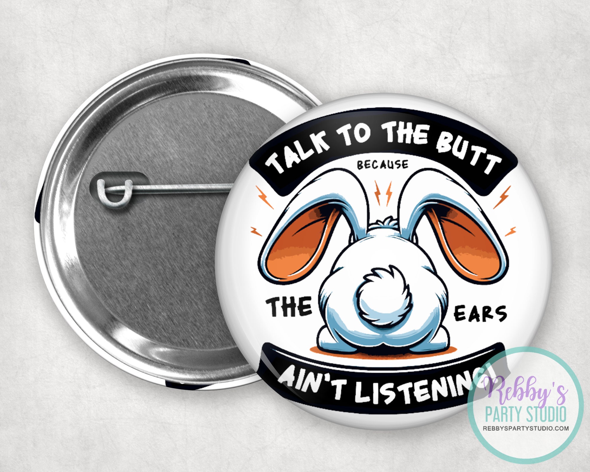 Add a little sass and humor to your outfit, bag, or gift with this Funny Bunny “Talk to the Butt” pinback button. Featuring a playful bunny design with bold lettering, this badge is perfect for anyone who enjoys quirky accessories and lighthearted humor.
