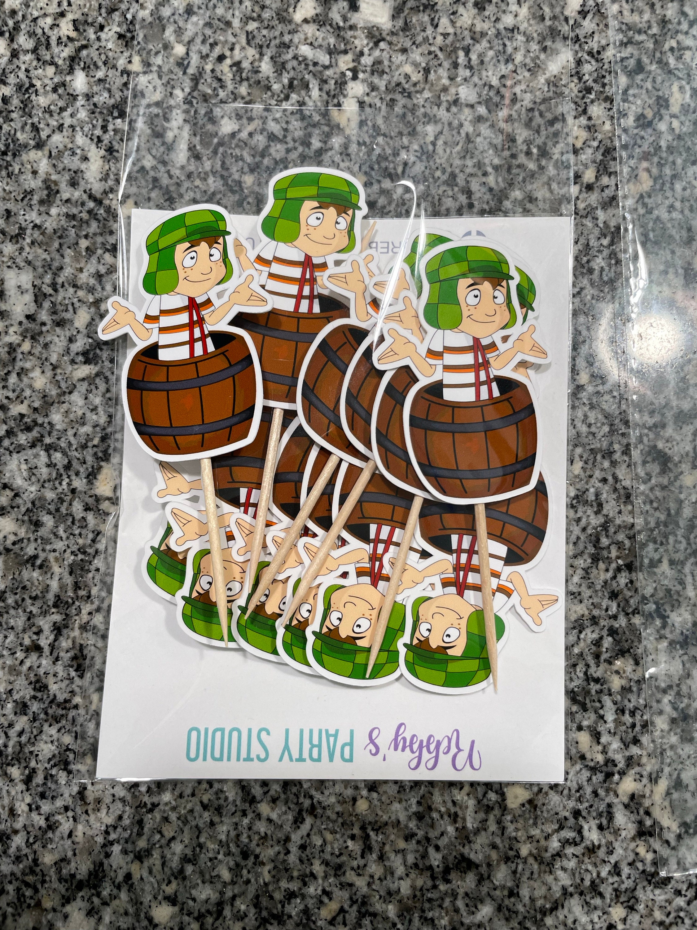 Set of 12 Chavo en el Barril cupcake toppers printed on high quality cardstock glued to a round sturdy toothpick, you will receive 12 picks shown in the sample picture. Toppers are handcrafted and handmade by me for a unique look that can't be found in a regular party supply store. They have many uses you can place them on cupcakes, cookies, sandwiches, brownies, fruits, cheese and more!