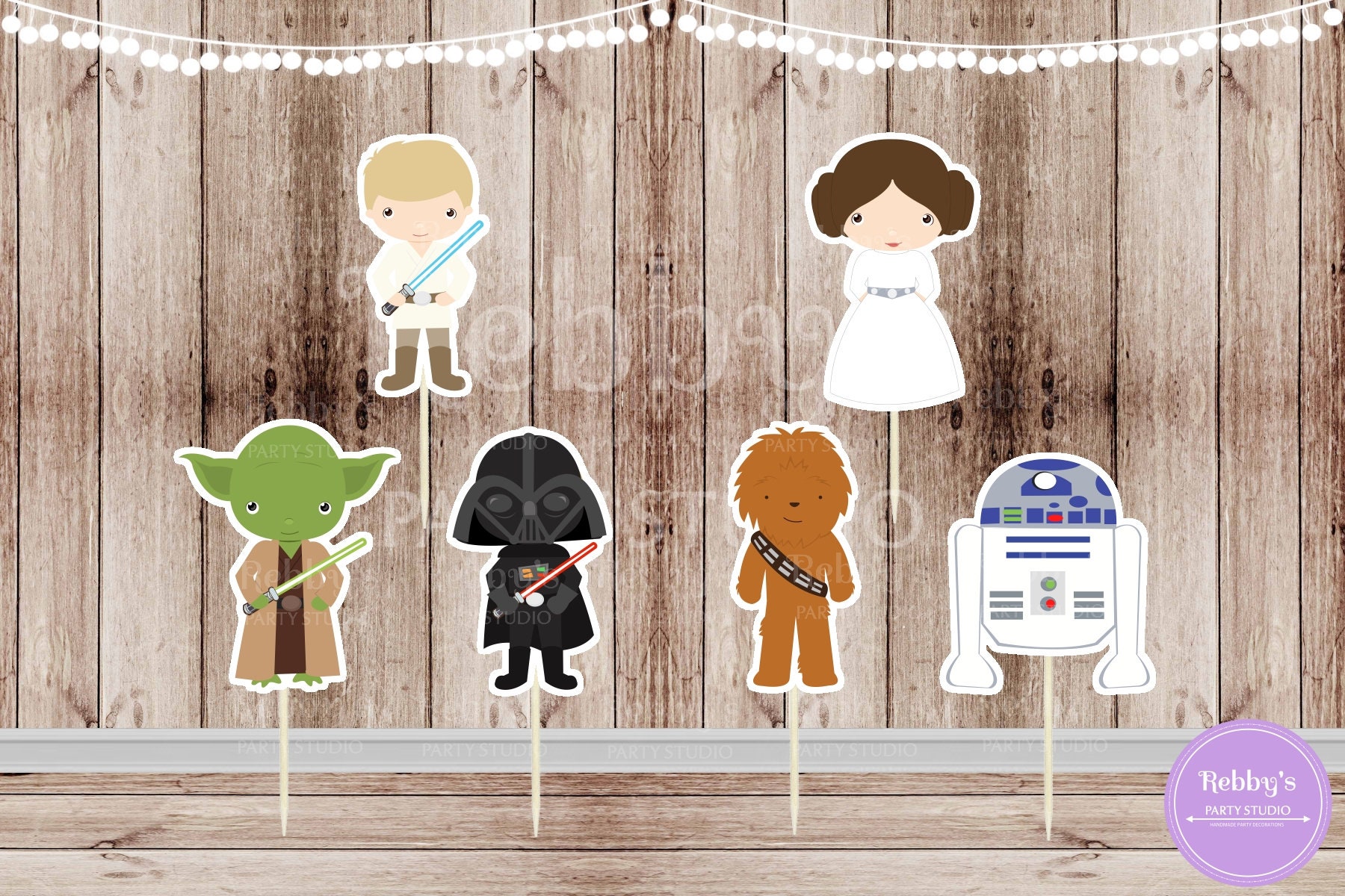 Set of 12 Assorted Space Wars cupcake toppers printed on high quality cardstock glued to a round sturdy toothpick, you will receive 12 picks 2 of each shown in the sample picture. Toppers are handcrafted and handmade by me for a unique look that can't be found in a regular party supply store. They have many uses you can place them on cupcakes, cookies, sandwiches, brownies, fruits, cheese and more!