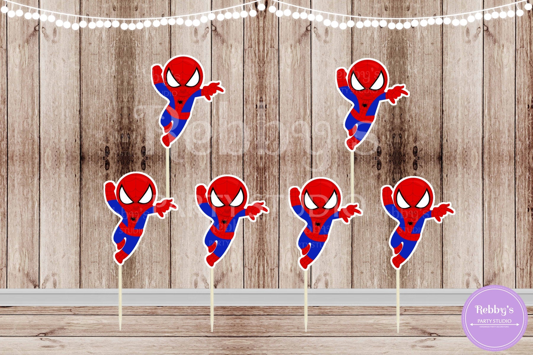 Set of 12 Spider-Boy cupcake toppers printed on high quality cardstock glued to a round sturdy toothpick, you will receive 12 picks shown in the sample picture. Toppers are handcrafted and handmade by me for a unique look that can't be found in a regular party supply store. They have many uses you can place them on cupcakes, cookies, sandwiches, brownies, fruits, cheese and more!