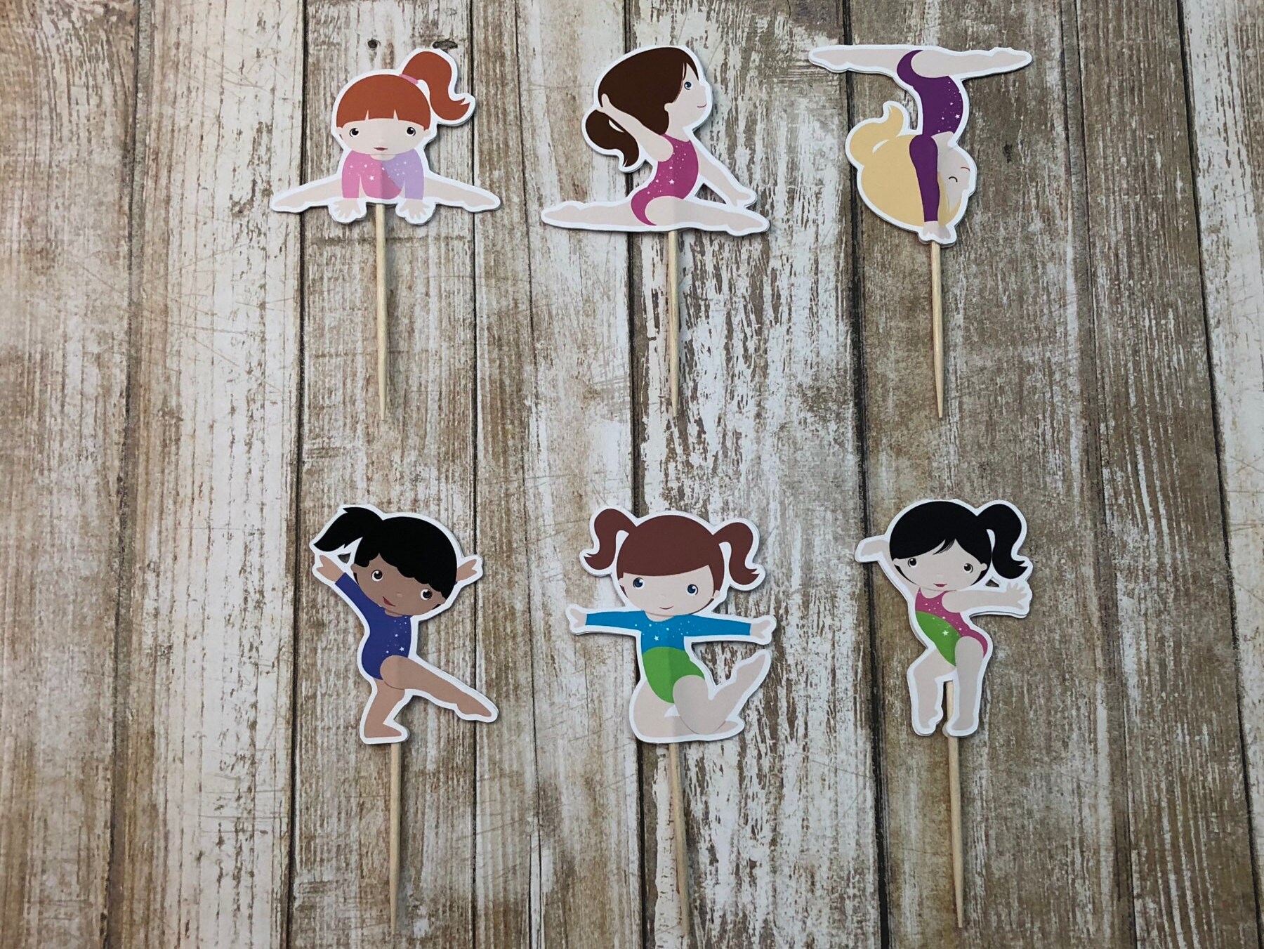 Set of 12 Girl Gymnastic cupcake toppers printed on high quality cardstock glued to a round sturdy toothpick, you will receive 12 picks 2 of each shown in the sample picture. Toppers are handcrafted and handmade by me for a unique look that can't be found in a regular party supply store. They have many uses you can place them on cupcakes, cookies, sandwiches, brownies, fruits, cheese and more!