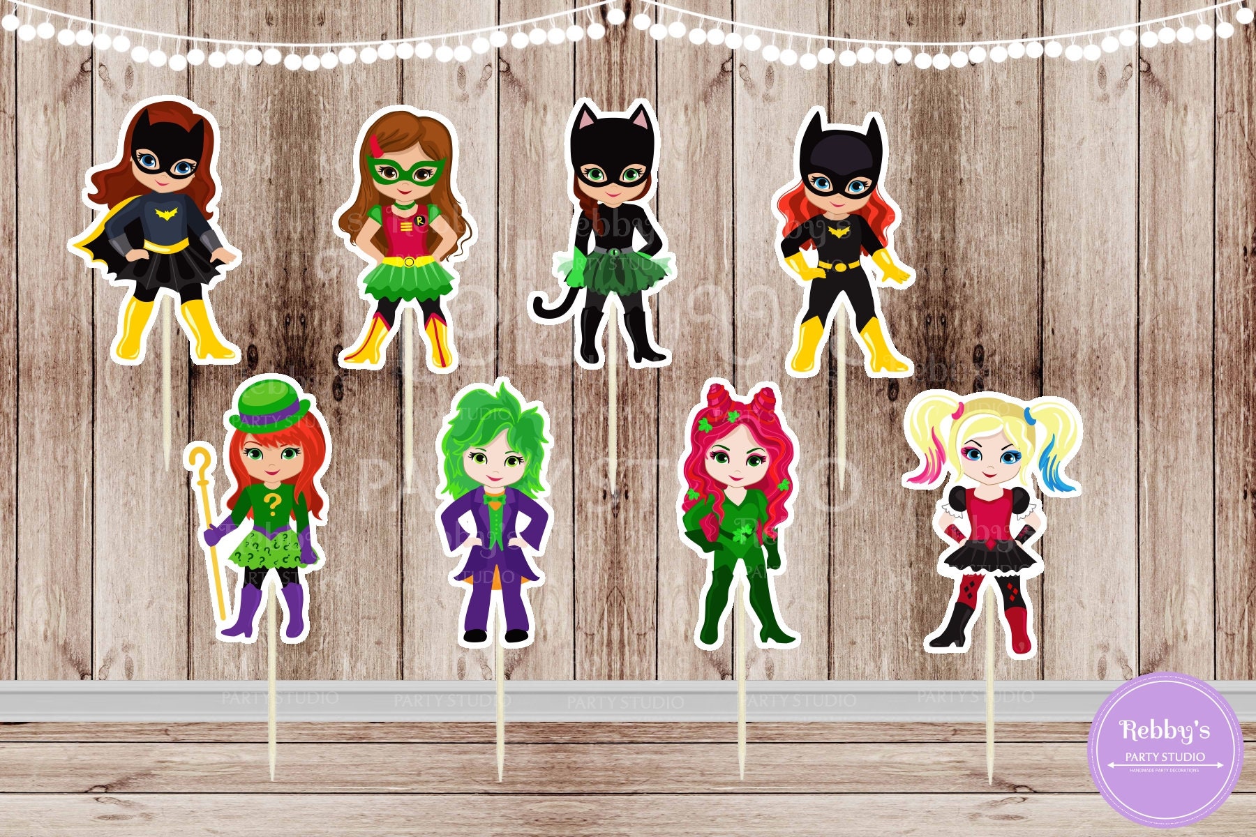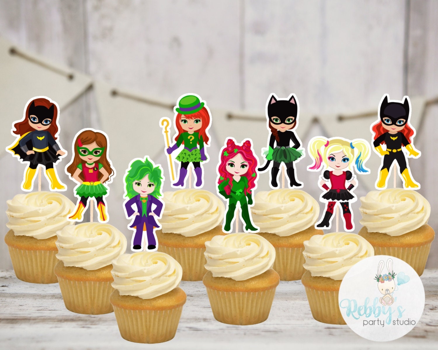 Set of 16 Assorted Girl Superhero Villains cupcake toppers printed on high quality cardstock glued to a round sturdy toothpick, you will receive 16 picks 2 of each shown in the sample picture. Toppers are handcrafted and handmade by me for a unique look that can't be found in a regular party supply store. They have many uses you can place them on cupcakes, cookies, sandwiches, brownies, fruits, cheese and more!