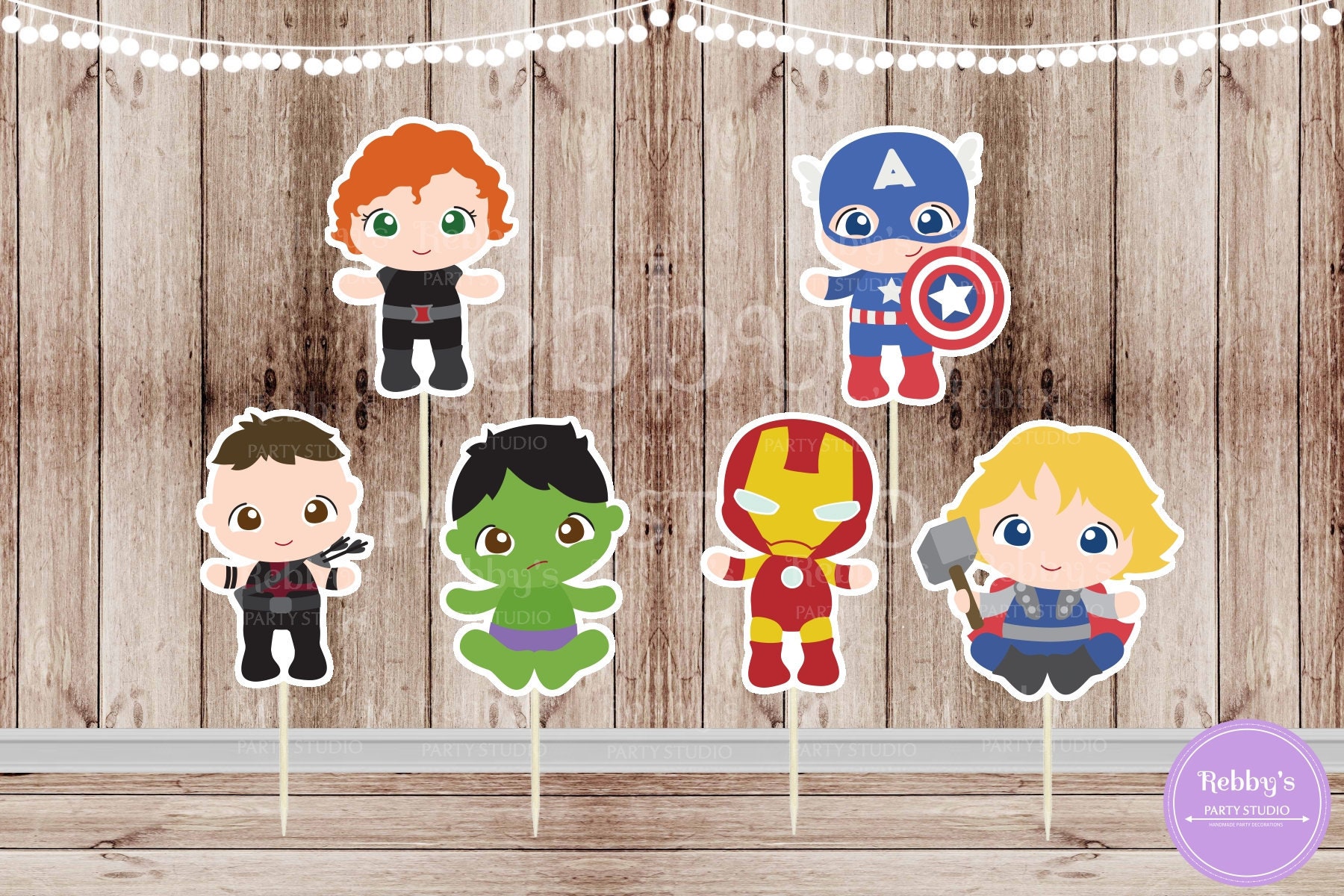 Set of 12 Assorted Baby Superheroes cupcake toppers printed on high quality cardstock glued to a round sturdy toothpick, you will receive 12 picks 2 of each shown in the sample picture. Toppers are handcrafted and handmade by me for a unique look that can't be found in a regular party supply store. They have many uses you can place them on cupcakes, cookies, sandwiches, brownies, fruits, cheese and more!