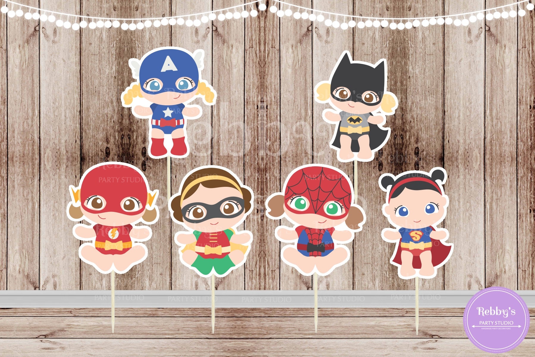 Set of 12 Assorted Baby Girl Superheroes cupcake toppers printed on high quality cardstock glued to a round sturdy toothpick, you will receive 12 picks 2 of each shown in the sample picture. Toppers are handcrafted and handmade by me for a unique look that can't be found in a regular party supply store. They have many uses you can place them on cupcakes, cookies, sandwiches, brownies, fruits, cheese and more!