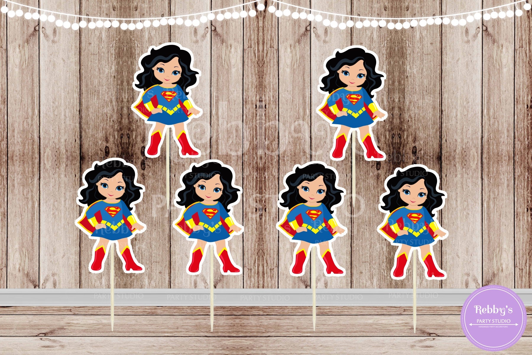 Set of 16 Superhero Supergirl cupcake toppers printed on high quality cardstock glued to a round sturdy toothpick, you will receive 16 picks shown in the sample picture. Toppers are handcrafted and handmade by me for a unique look that can't be found in a regular party supply store. They have many uses you can place them on cupcakes, cookies, sandwiches, brownies, fruits, cheese and more!