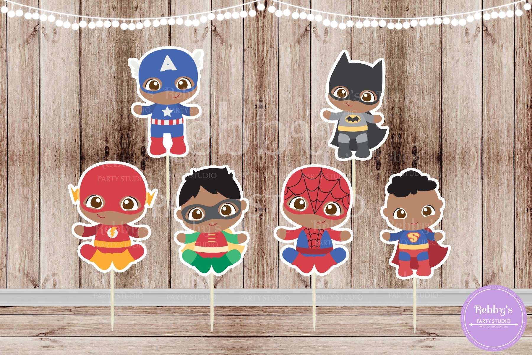 Set of 12 Assorted African American Baby Boy cupcake toppers printed on high quality cardstock glued to a round sturdy toothpick, you will receive 12 picks 2 of each shown in the sample picture. Toppers are handcrafted and handmade by me for a unique look that can't be found in a regular party supply store. They have many uses you can place them on cupcakes, cookies, sandwiches, brownies, fruits, cheese and more!