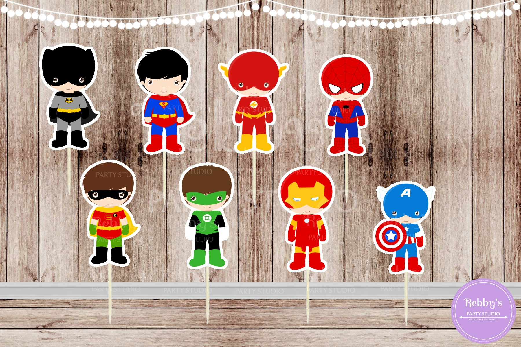 Set of 16 Assorted Superhero Boys cupcake toppers printed on high quality cardstock glued to a round sturdy toothpick, you will receive 16 picks 2 of each shown in the sample picture. Toppers are handcrafted and handmade by me for a unique look that can't be found in a regular party supply store. They have many uses you can place them on cupcakes, cookies, sandwiches, brownies, fruits, cheese and more!