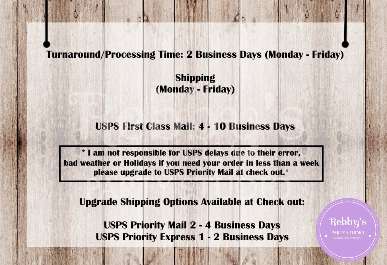 To determine when your order will arrive, allow 2 to 3 business days for processing plus the transit time of your choosing, the processing time is to personalize, print, cut, assemble, pack.