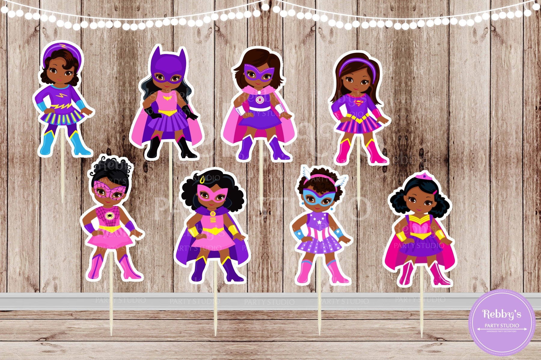 Set of 16 Assorted African American Pink Superhero Girls cupcake toppers printed on high quality cardstock glued to a round sturdy toothpick, you will receive 16 picks 2 of each shown in the sample picture. Toppers are handcrafted and handmade by me for a unique look that can't be found in a regular party supply store. They have many uses you can place them on cupcakes, cookies, sandwiches, brownies, fruits, cheese and more!