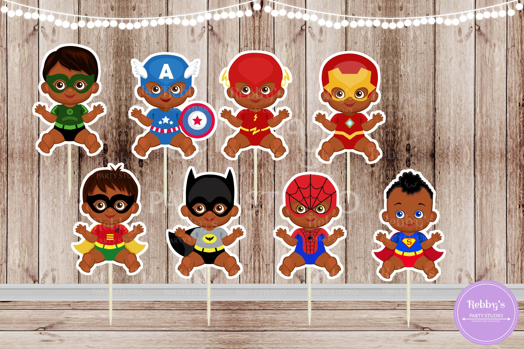 Set of 16 Assorted African American Superhero Baby Boys cupcake toppers printed on high quality cardstock glued to a round sturdy toothpick, you will receive 12 picks 2 of each shown in the sample picture. Toppers are handcrafted and handmade by me for a unique look that can't be found in a regular party supply store. They have many uses you can place them on cupcakes, cookies, sandwiches, brownies, fruits, cheese and more!