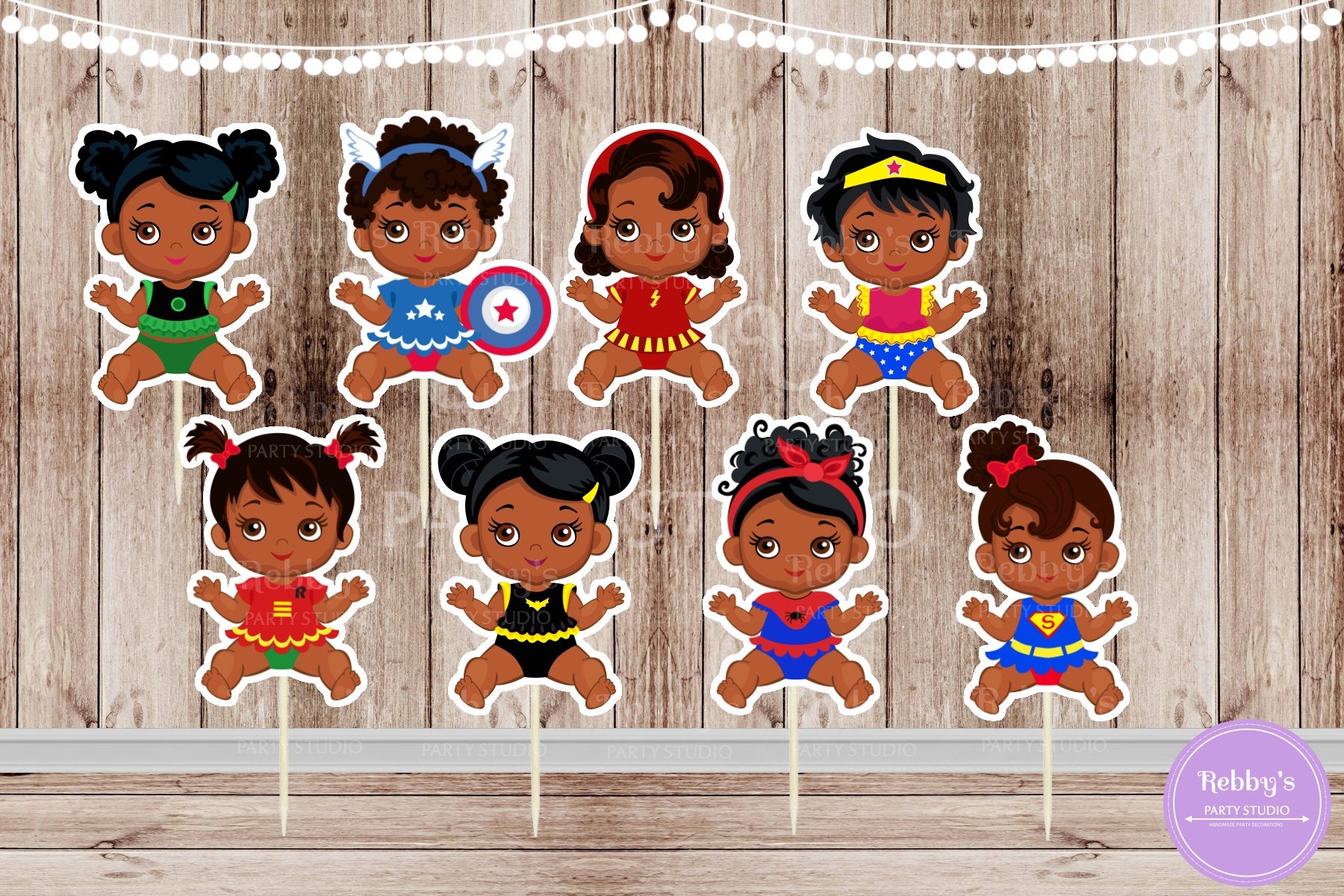 Set of 16 Assorted African American Superhero Baby Girls cupcake toppers printed on high quality cardstock glued to a round sturdy toothpick, you will receive 16 picks 2 of each shown in the sample picture. Toppers are handcrafted and handmade by me for a unique look that can't be found in a regular party supply store. They have many uses you can place them on cupcakes, cookies, sandwiches, brownies, fruits, cheese and more!