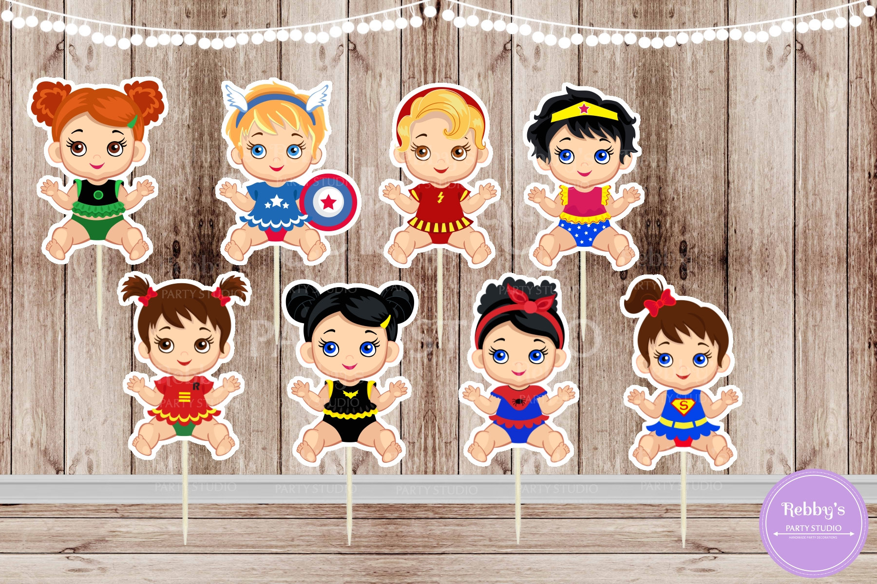 Set of 16 Assorted Superhero Baby Girls cupcake toppers printed on high quality cardstock glued to a round sturdy toothpick, you will receive 16 picks 2 of each shown in the sample picture. Toppers are handcrafted and handmade by me for a unique look that can't be found in a regular party supply store. They have many uses you can place them on cupcakes, cookies, sandwiches, brownies, fruits, cheese and more!