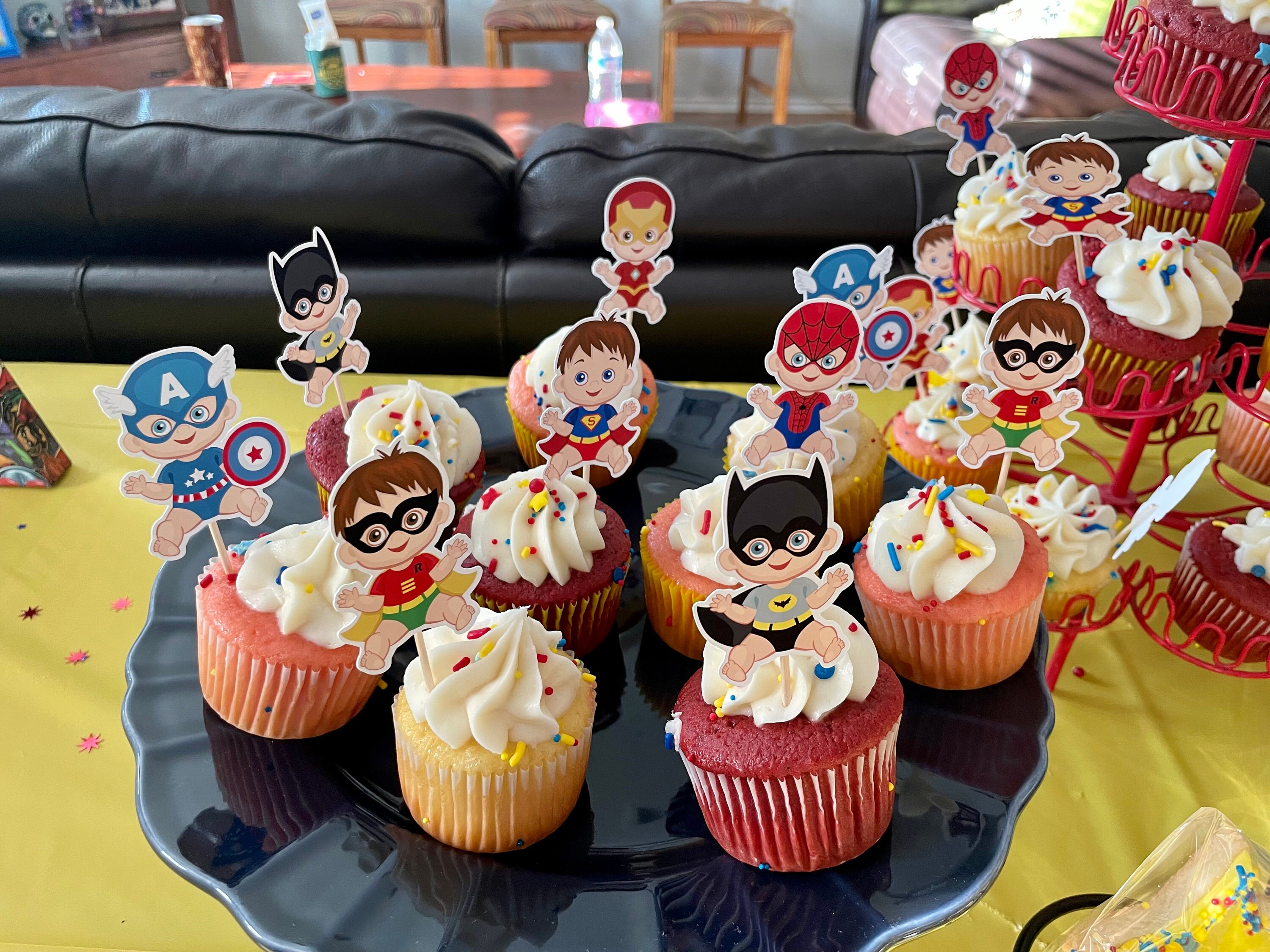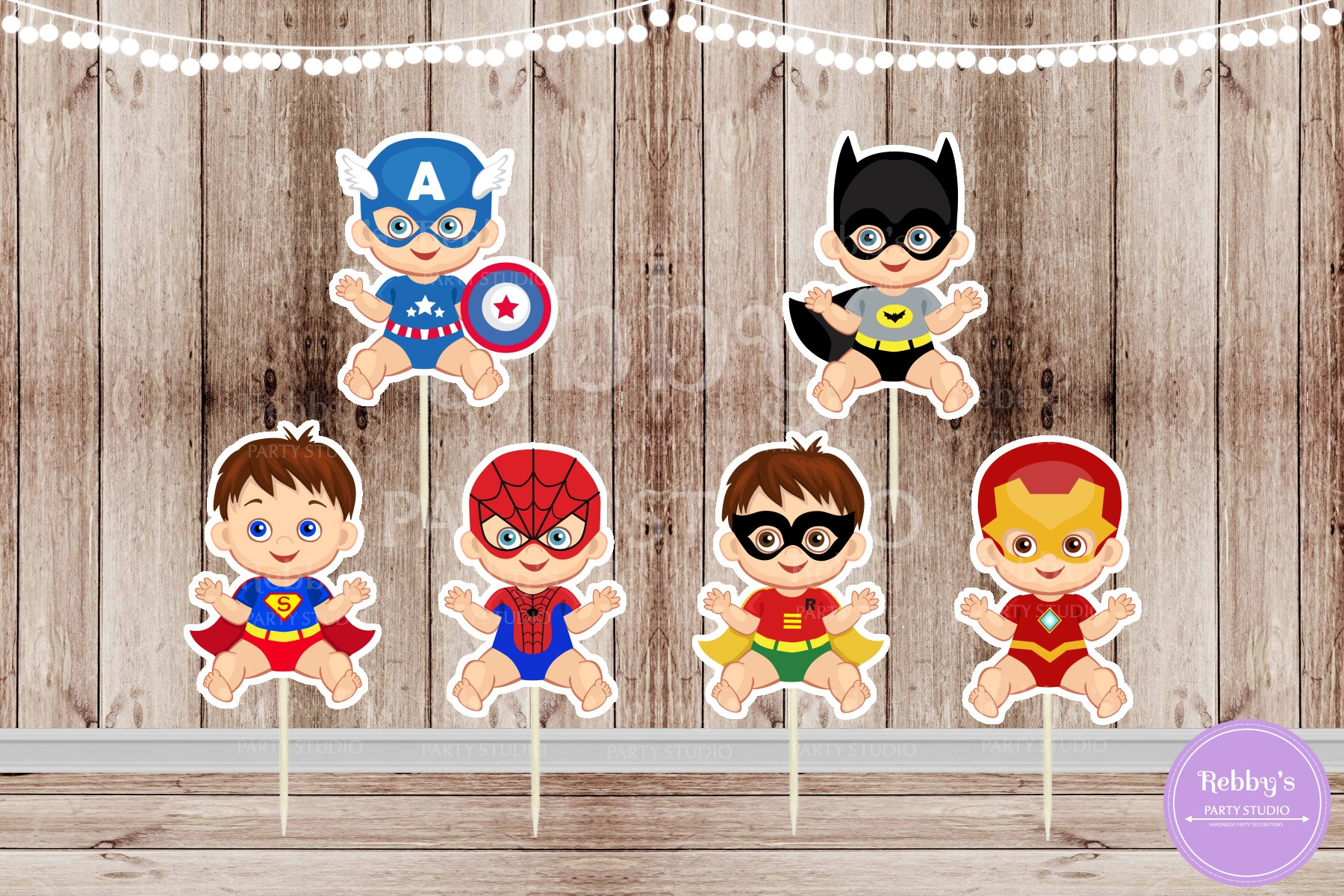 Set of 12 Assorted Superhero Baby Boys cupcake toppers printed on high quality cardstock glued to a round sturdy toothpick, you will receive 12 picks 2 of each shown in the sample picture. Toppers are handcrafted and handmade by me for a unique look that can't be found in a regular party supply store. They have many uses you can place them on cupcakes, cookies, sandwiches, brownies, fruits, cheese and more!