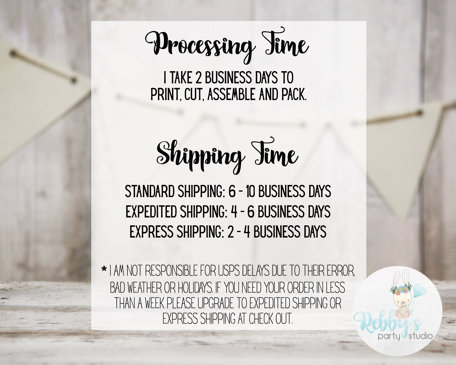 To determine when your order will arrive, allow 2 to 3 business days for processing plus the transit time of your choosing, the processing time is to personalize, print, cut, assemble, pack.
