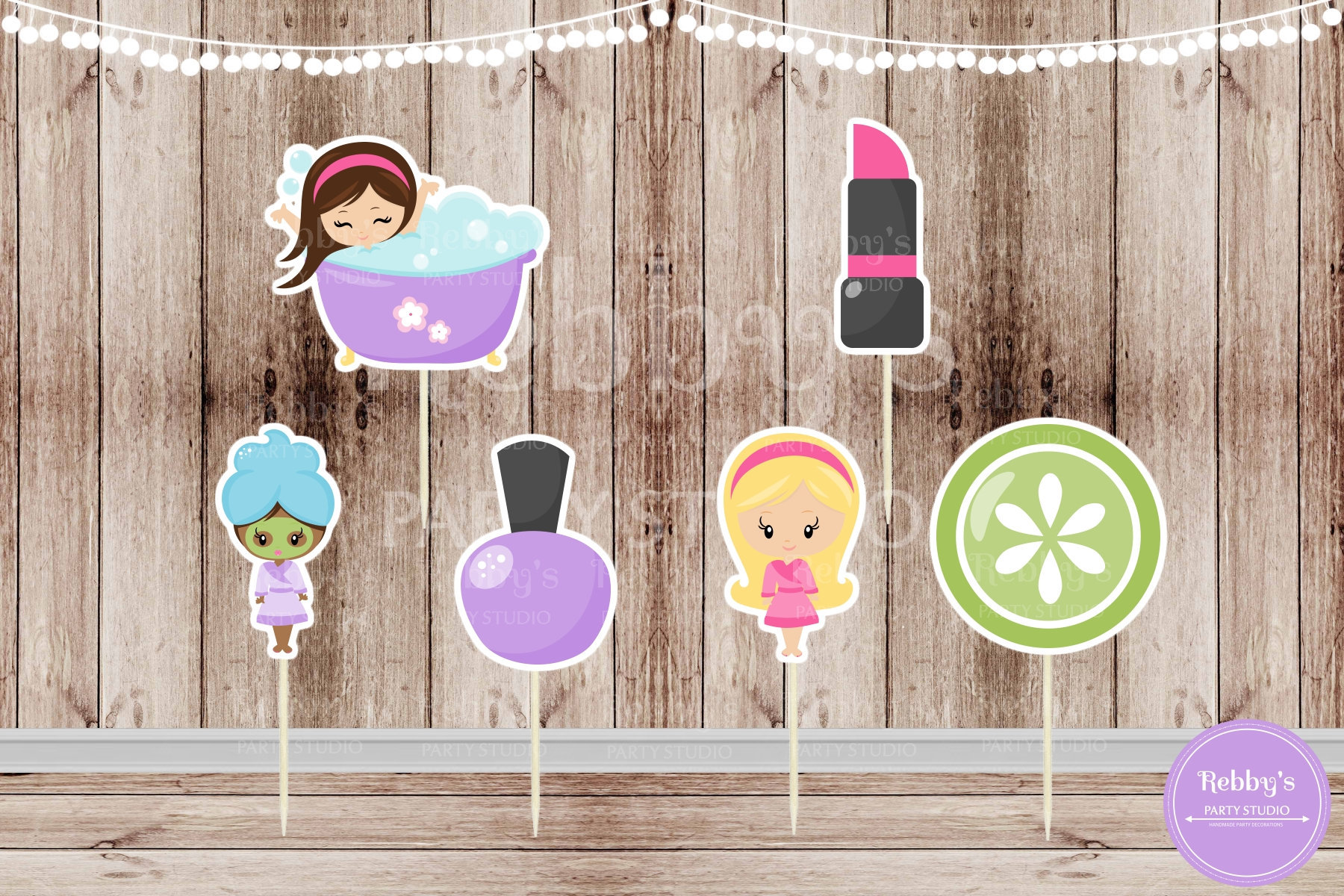 Set of 12 Assorted Spa Girl cupcake toppers printed on high quality cardstock glued to a round sturdy toothpick, you will receive 12 picks 2 of each shown in the sample picture. Toppers are handcrafted and handmade by me for a unique look that can't be found in a regular party supply store. They have many uses you can place them on cupcakes, cookies, sandwiches, brownies, fruits, cheese and more!