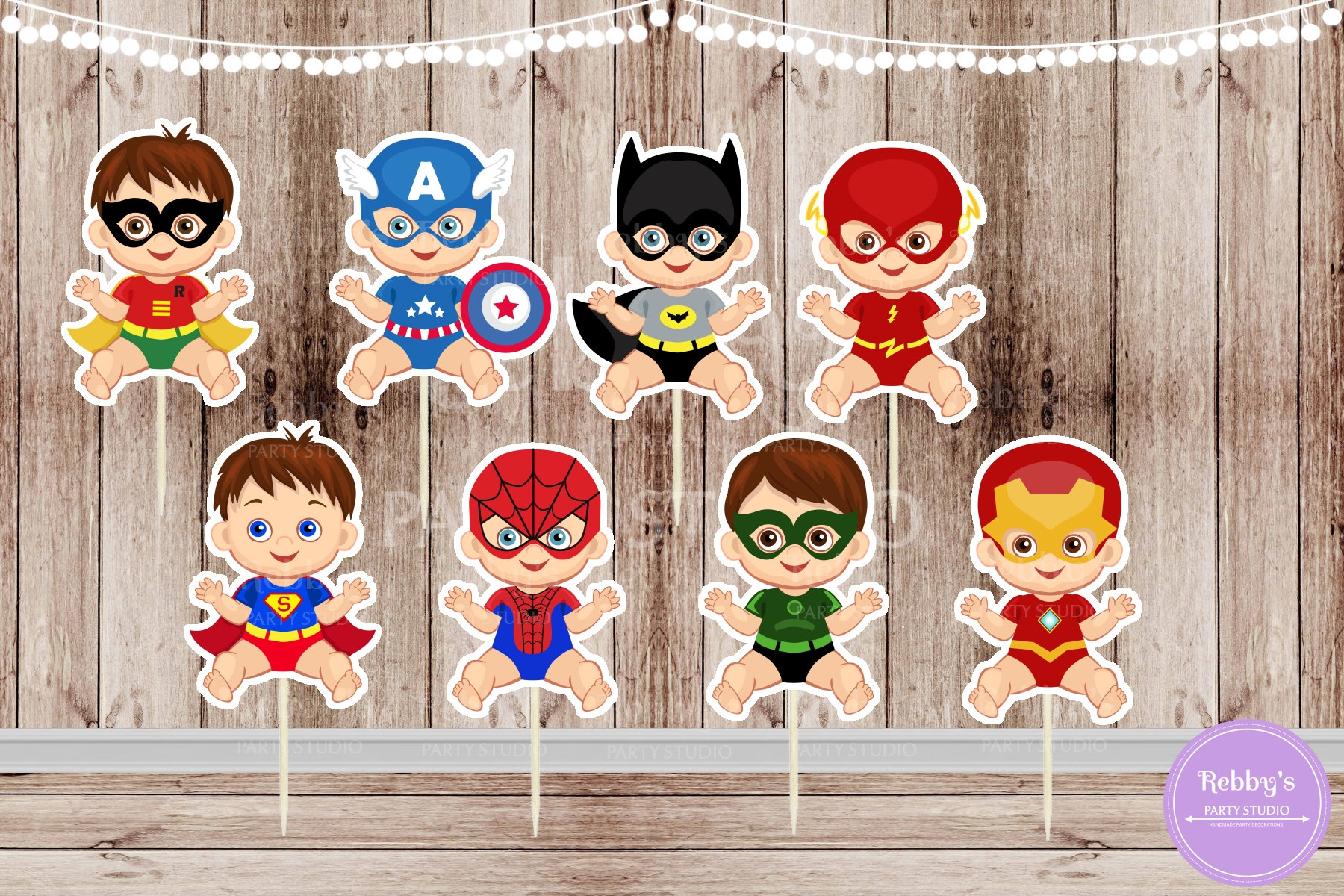 Set of 16 Assorted Superhero Baby Boys cupcake toppers printed on high quality cardstock glued to a round sturdy toothpick, you will receive 16 picks 2 of each shown in the sample picture. Toppers are handcrafted and handmade by me for a unique look that can't be found in a regular party supply store. They have many uses you can place them on cupcakes, cookies, sandwiches, brownies, fruits, cheese and more!