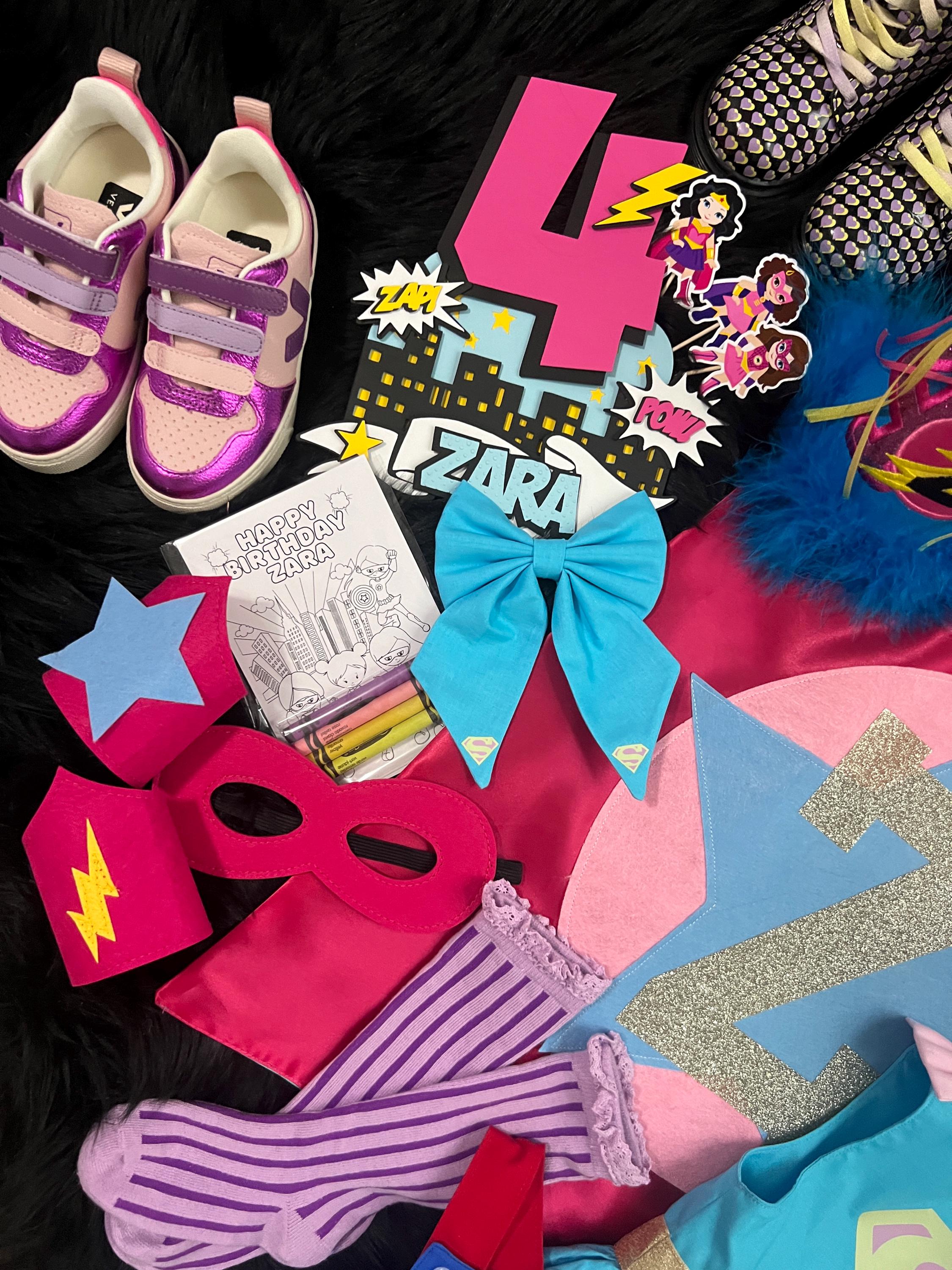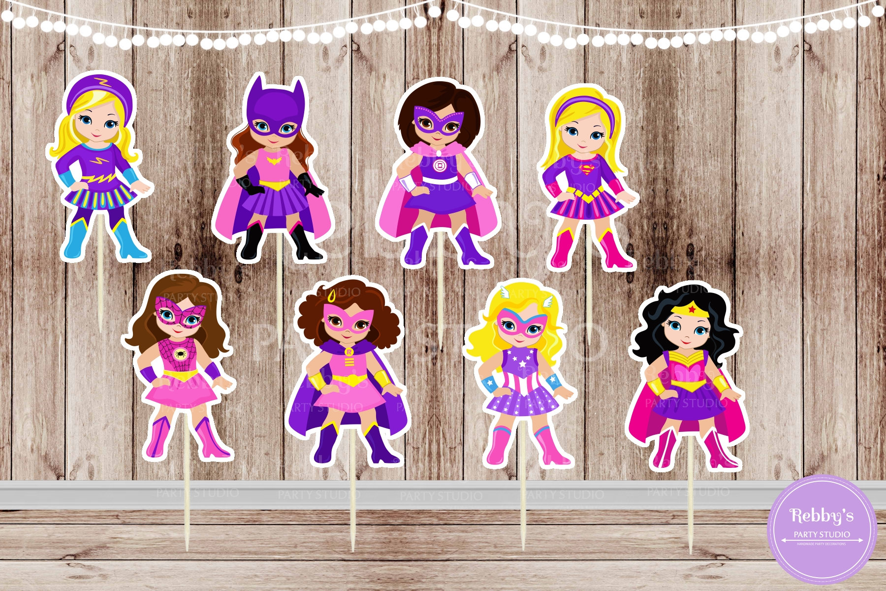 Set of 16 Assorted Pink Superhero Girls cupcake toppers printed on high quality cardstock glued to a round sturdy toothpick, you will receive 16 picks 2 of each shown in the sample picture. Toppers are handcrafted and handmade by me for a unique look that can't be found in a regular party supply store. They have many uses you can place them on cupcakes, cookies, sandwiches, brownies, fruits, cheese and more!