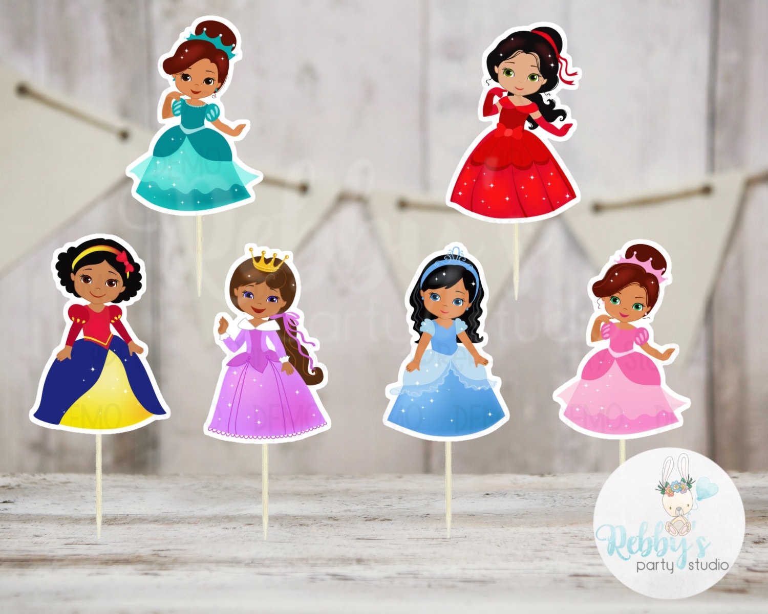 Set of 12 Assorted Multicultural Princess cupcake toppers printed on high quality cardstock glued to a round sturdy toothpick, you will receive 12 picks 2 of each shown in the sample picture. Toppers are handcrafted and handmade by me for a unique look that can't be found in a regular party supply store. They have many uses you can place them on cupcakes, cookies, sandwiches, brownies, fruits, cheese and more!