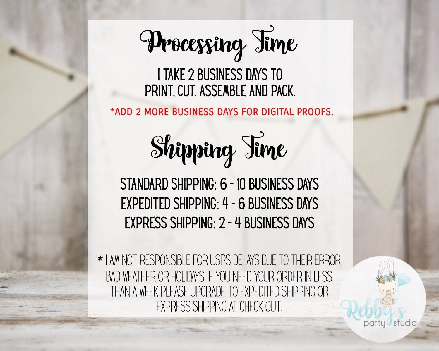 To determine when your order will arrive, allow 2 to 3 business days for processing plus the transit time of your choosing, the processing time is to personalize, print, cut, assemble, pack.