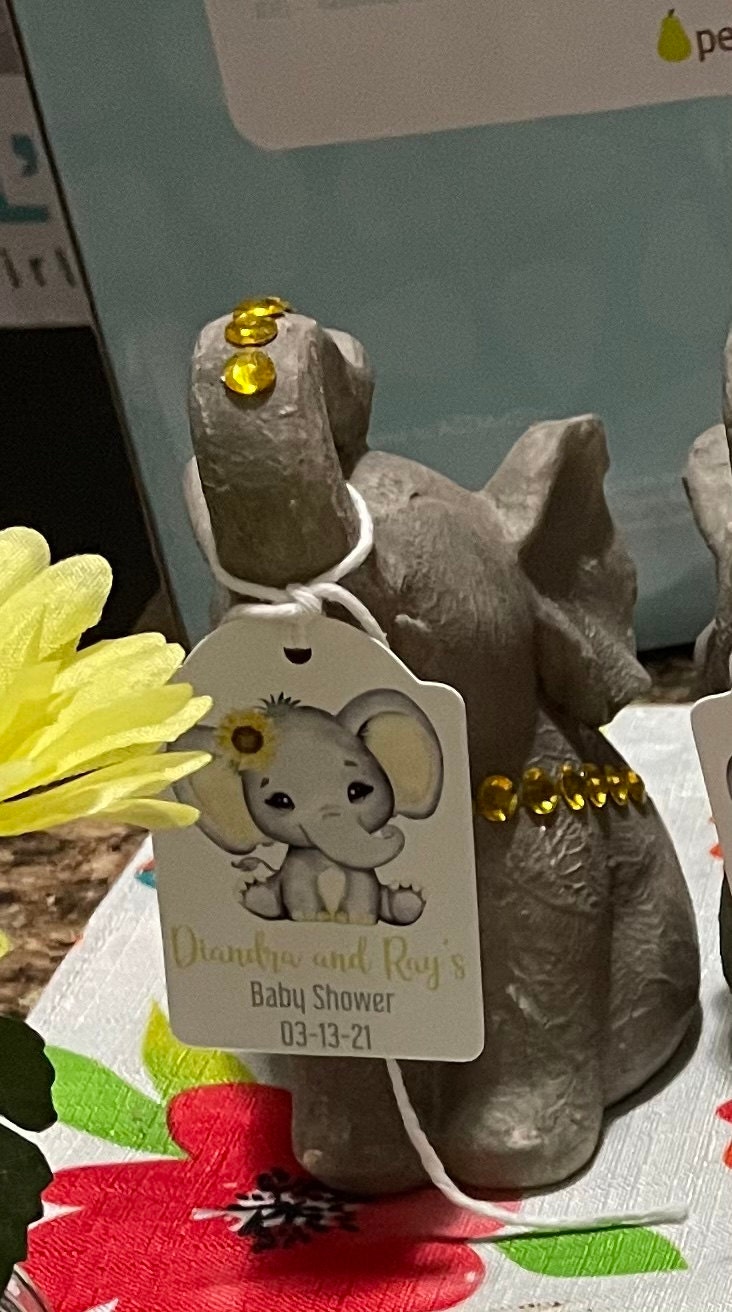 Sunflower Elephant Baby Shower Tags. Perfect for your next party. These tags are printed on one side on high quality card stock the back is blank. They come hole punched with 12" white twine attached. Tags are hand crafted for a unique look that can't be found in a regular party supply store.