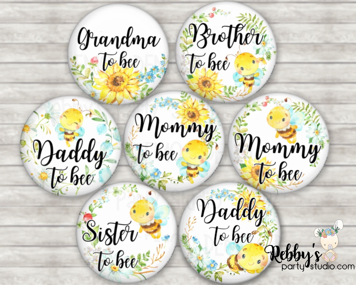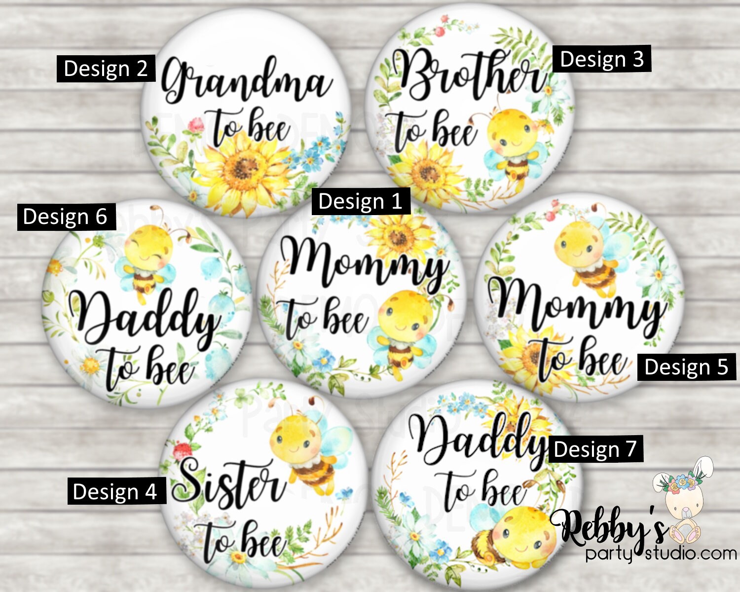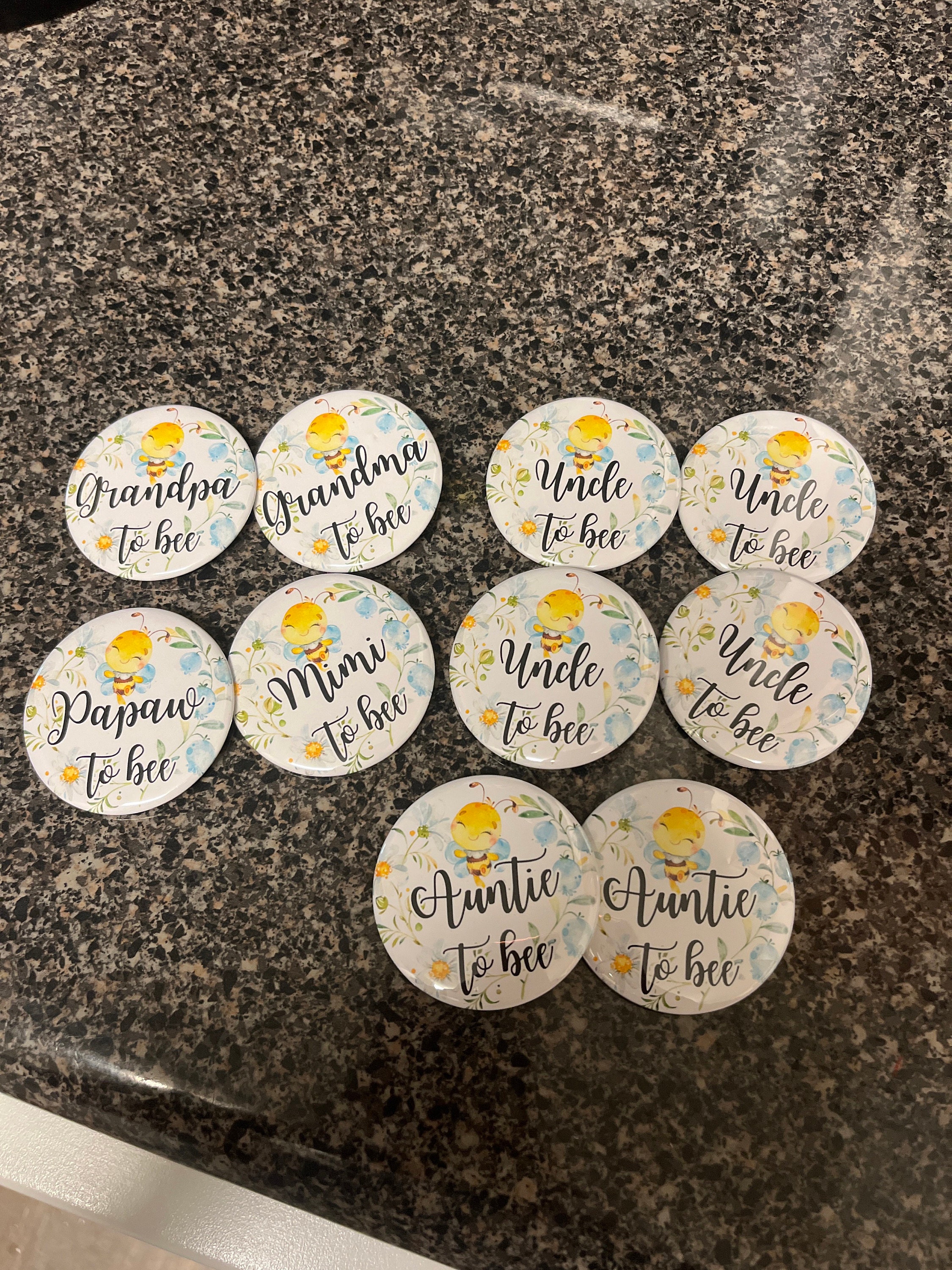 Custom personalized button pins, custom printed with any name, title or phrase. (Ex. Mommy to be, Mommy, Dad to be, or Daddy, Sister to be, etc.) These are a grate addition to any party.