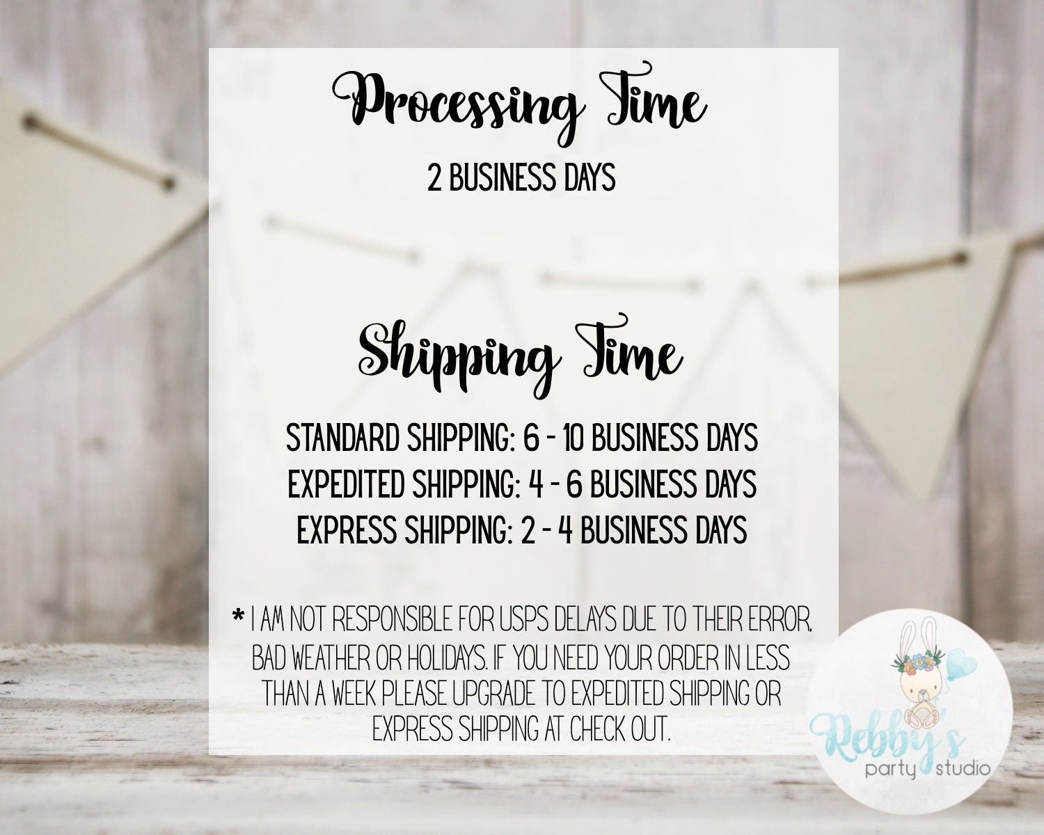 To determine when your order will arrive, allow 2 to 3 business days for processing plus the transit time of your choosing, the processing time is to personalize, print, cut, assemble, pack.