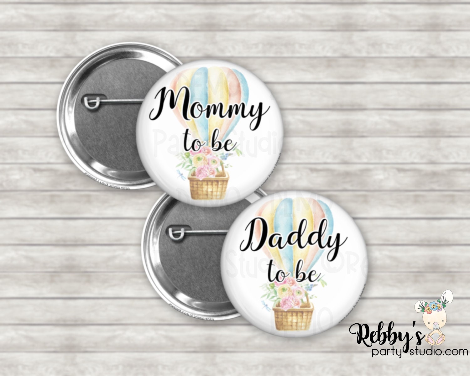 Custom personalized button pins, custom printed with any name, title or phrase. (Ex. Mommy to be, Mommy, Dad to be, or Daddy, Sister to be, etc.) These are a grate addition to any party.